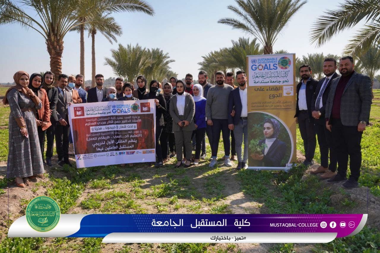 التقى السيد عميد كلية المستقبل الجامعة الاستاذ الدكتور حسن شاكر مجدي بخريجوا الكلية من كافة الاقسام الدراسية و الذين حصلوا على فرص عمل في الكلية في اقسامها الدراسية و وحداتها الادارية و تجاوز عددهم اكثر من (١٠٠) خريج .. و تأتي هذه المبادرة تحقيقًا للهدف الرابع في التنمية المستدامة. ((التعليم الجيد )) و ان الشهادة الجامعية تعطي لحاملها فرصة للعمل و التوظيف …و فيما شارك الخريجون و العاملين اعلاه في الكلية في حملة تطوعية في الزراعة المستدامة ضمن الهدف الثاني (( القضاء الفقر )) .. من خلال الزراعة المستدامة و تأمين الغذاء و الامن الغذائي … ان كلية المستقبل الجامعة .. تعمل بشكل متواصل مع موظفيها و طلبتها لتحقيق شعارها ((نحو جامعة مستدامة )) و المساهمة مع المجتمع المحلي و الدولي في تحقيق اهداف التنمية المستدامة