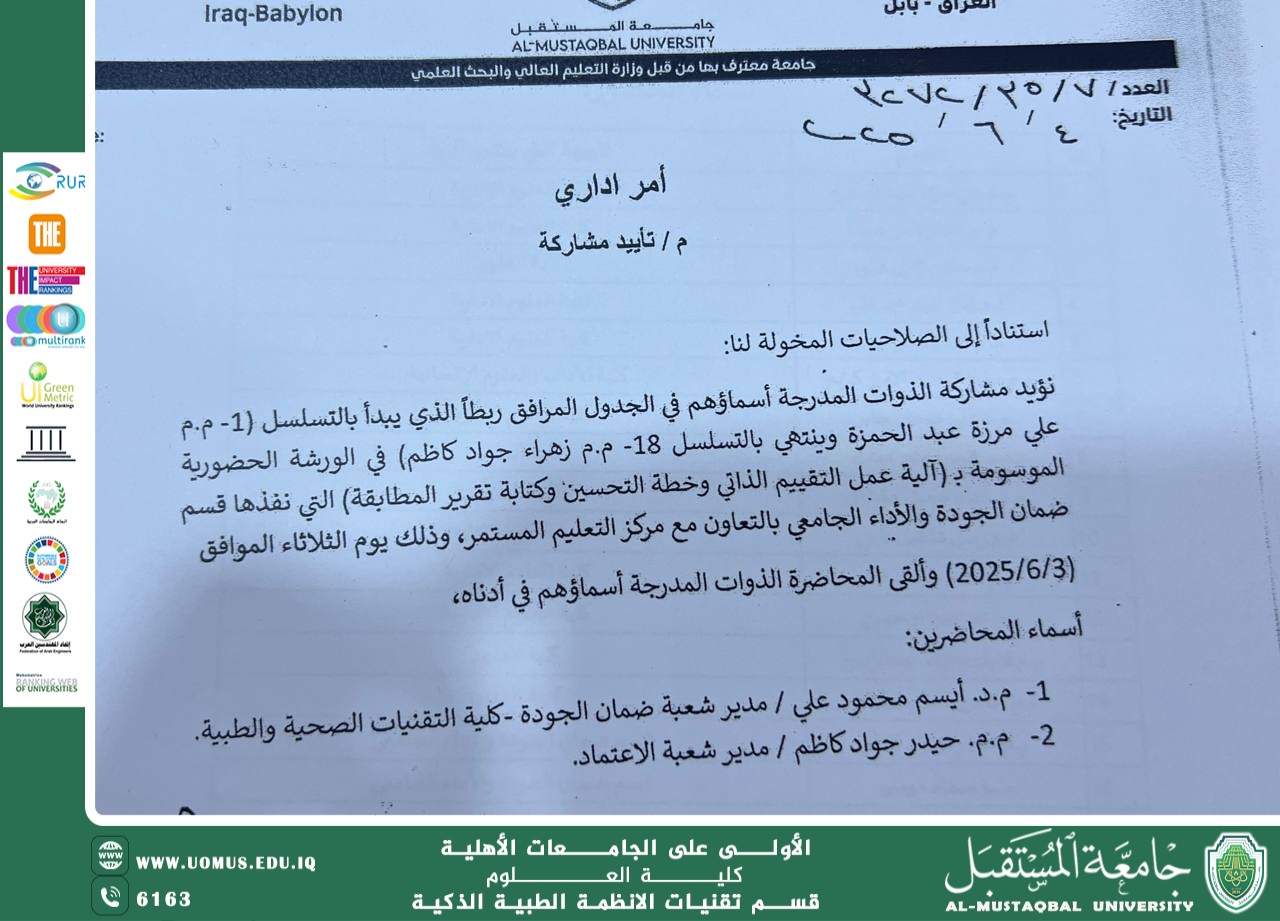 شارك التدريسي م.م قصي منير دياب، مسؤول لجنة الجودة في قسم الأنظمة الطبية الذكية ...