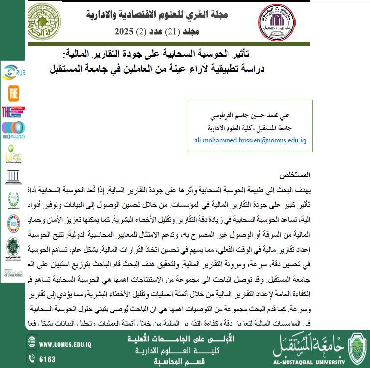 شر بحث علمي محلي لتدريسي في قسم المحاسبة ( م.د علي محمد حسين) في مجلة الغري للعل...