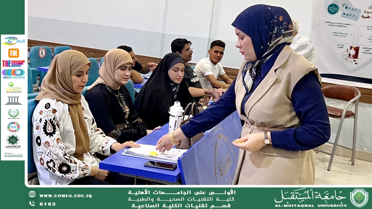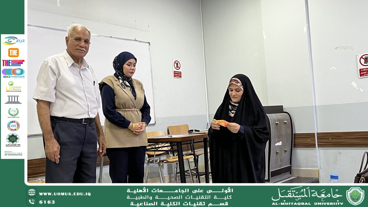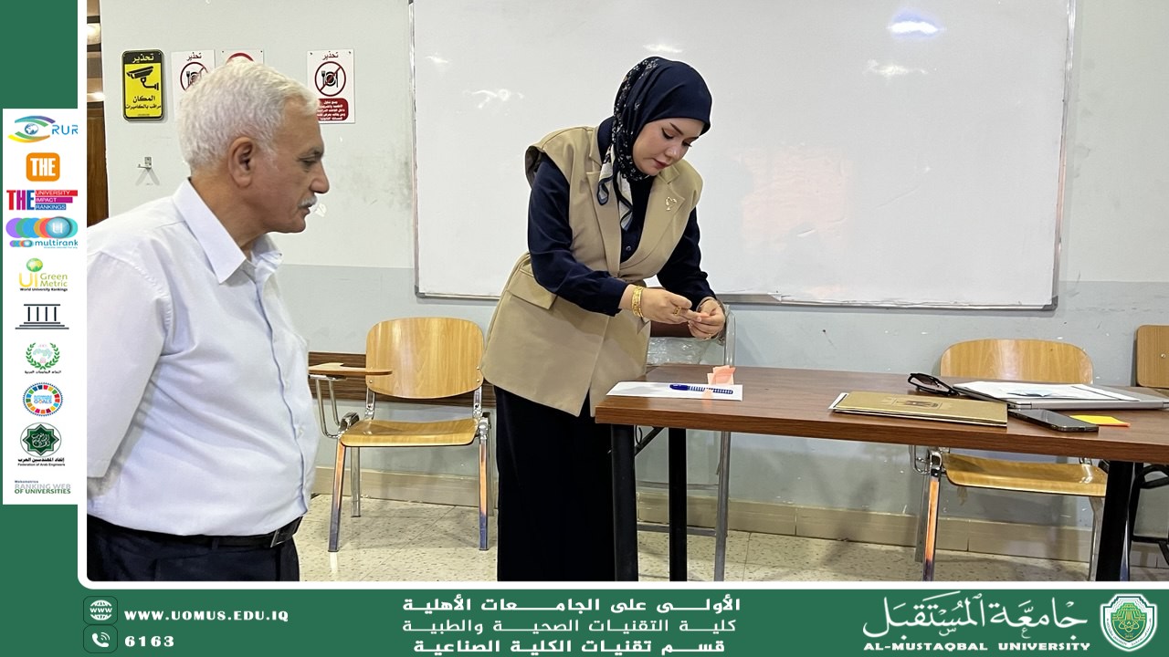 In pursuit of the Sustainable Development Goals, particularly Goal 4: Quality Education, and under the leadership of Professor Dr. Younis Abdul Ridha Al-Khafaji, Head of the Department of Industrial Technologies, and the supervision of Lecturer Zainab Ali Mohsen Al-Khafaji, Department Rapporteur, the Department of Industrial Technologies at the College of Health and Medical Technologies – Al-Mustaqbal University, conducted the election of the second-year student representative for the academic year 2025–2026.