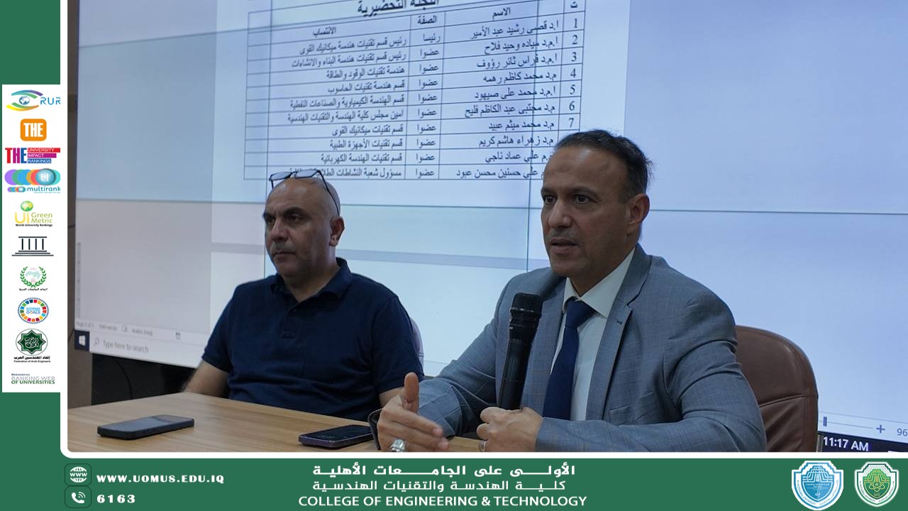 A coordination meeting was held on Monday, October 6, 2025, in the Conference Hall of the Engineering Building, chaired by the Dean of the College of Engineering and Engineering Technologies, Asst. Prof. Dr. Azhar Mohsen Abd, to discuss the preparations and organizational arrangements for the Third International Conference. The meeting was attended by the Assistant Dean for Scientific Affairs, Asst. Prof. Dr. Ameen Mohammed Kitab, along with the heads of departments and concerned committees.