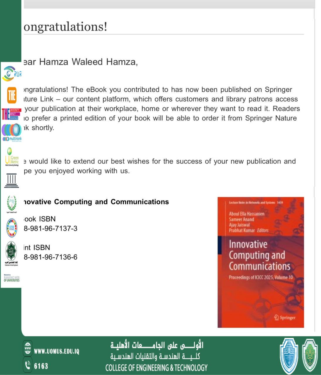 A research paper by Hamza Waleed Hamza was published in the proceedings of the Innovative Computing and Communications Conference (ICICC 2025), issued by the renowned Springer publishing house, entitled: