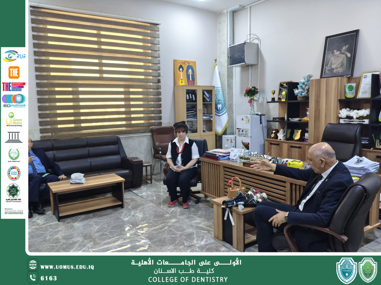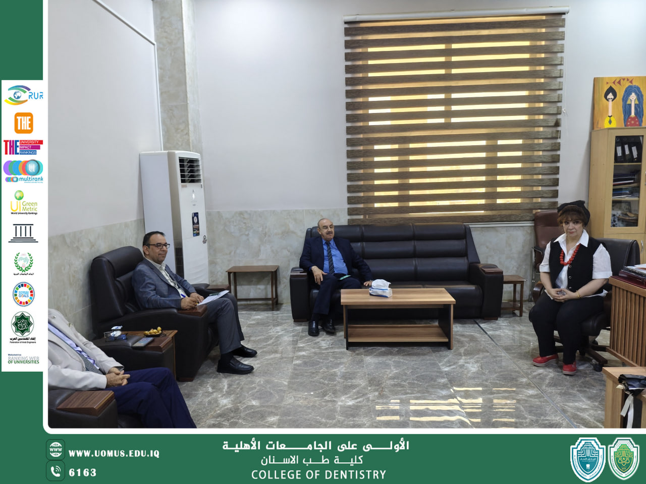 A scientific and official meeting was held on Tuesday, September 23, 2025, by Prof. Dr. Muzafar Sadiq Al-Zuhairi, Dr. Tareq Jawad Kadhim, and Dr. Samir Ibrahim, with the presence of the Dean of the College of Dentistry, Prof. Dr. Athraa Yahya Al-Hijazi, the Scientific Associate Dean Dr. Basim Kareem, and Prof. Dr. Saad Mohammed Ali, at the College of Dentistry – Al-Mustaqbal University. The meeting focused on discussing the establishment of the Research Unit at the College of Dentistry.
