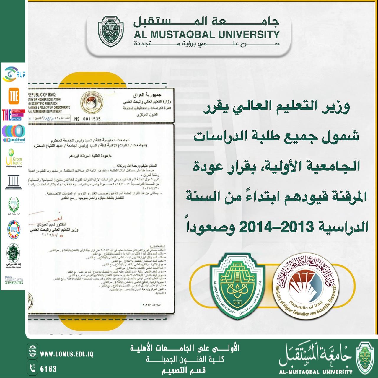The Minister of Higher Education and Scientific Research, Dr. Naeem Al-Aboudi, has announced a decis...