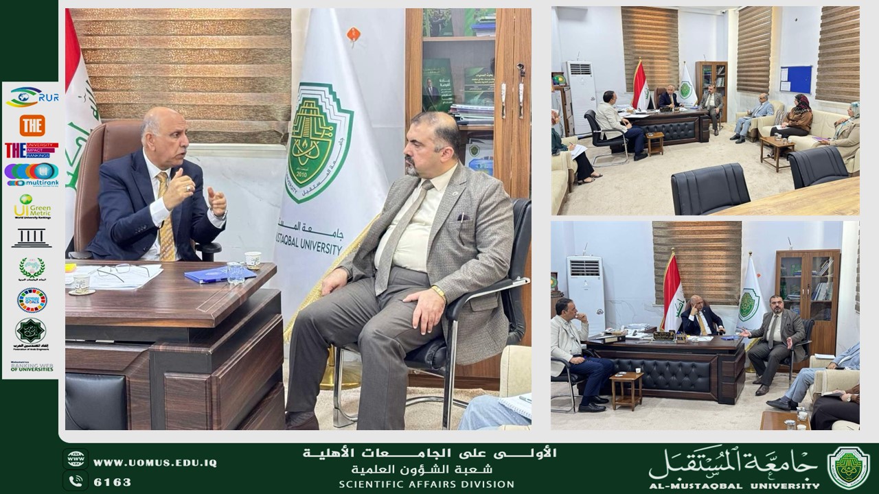 Al-Mustaqbal University, through its Office of Scientific and Academic Supervision, held the first preparatory meeting for the upcoming International Scientific Conference on Artificial Intelligence Applications in Medical Education, organized by the College of Medicine. The meeting, chaired by Prof. Dr. Mudhaffar Sadiq Al-Zuhairy, Director of Scientific and Academic Supervision, and attended by Prof. Dr. Walaa Al-Falluji, Dean of the College of Medicine, Prof. Dr. Tariq J. Al-Musawi, Director of the Scientific Affairs Department, along with several department heads and faculty members, focused on reviewing the main themes of the conference and outlining its preliminary schedule. Participants discussed the technical and logistical arrangements required to ensure the success of the event, as well as strategies for establishing local and international partnerships with universities, research institutions, and scientific publishing bodies to secure high-quality academic outcomes. Scheduled for April 2026, the conference will bring together researchers and experts from Iraq and abroad specializing in medicine and artificial intelligence. It aims to serve as a pioneering platform for advancing innovation in medical education and strengthening Al-Mustaqbal University’s leadership in integrating modern technologies within academic and scientific development.