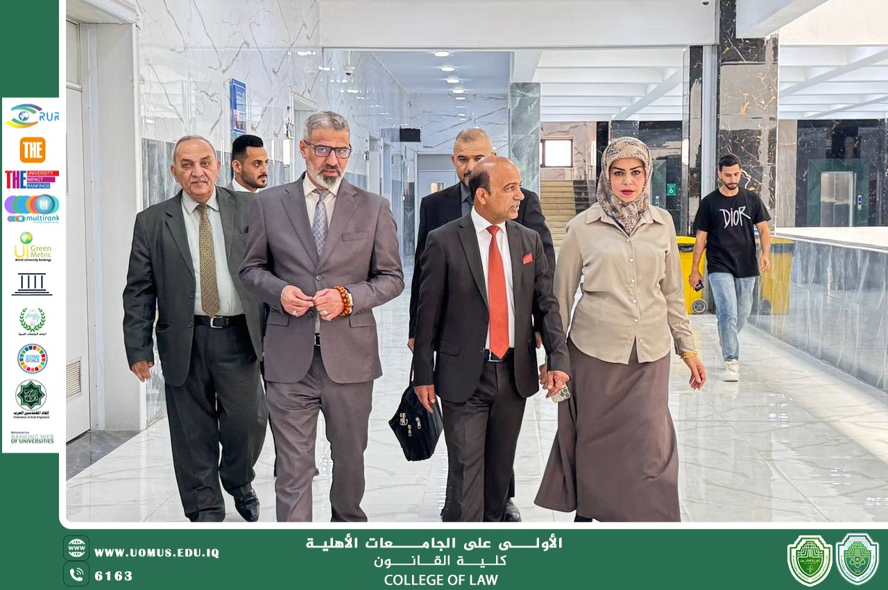 The committee was headed by Professor Dr. Miri Kazem Al-Khikani, Dean of the College of Law at the University of Babylon and Head of the Committee of Deans of Law Colleges in Iraq. He was accompanied by members of the ministerial committee during the inspection tour of the college facilities and exam halls.