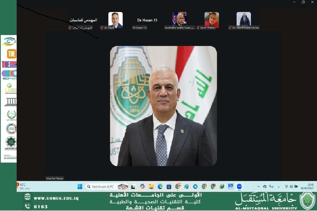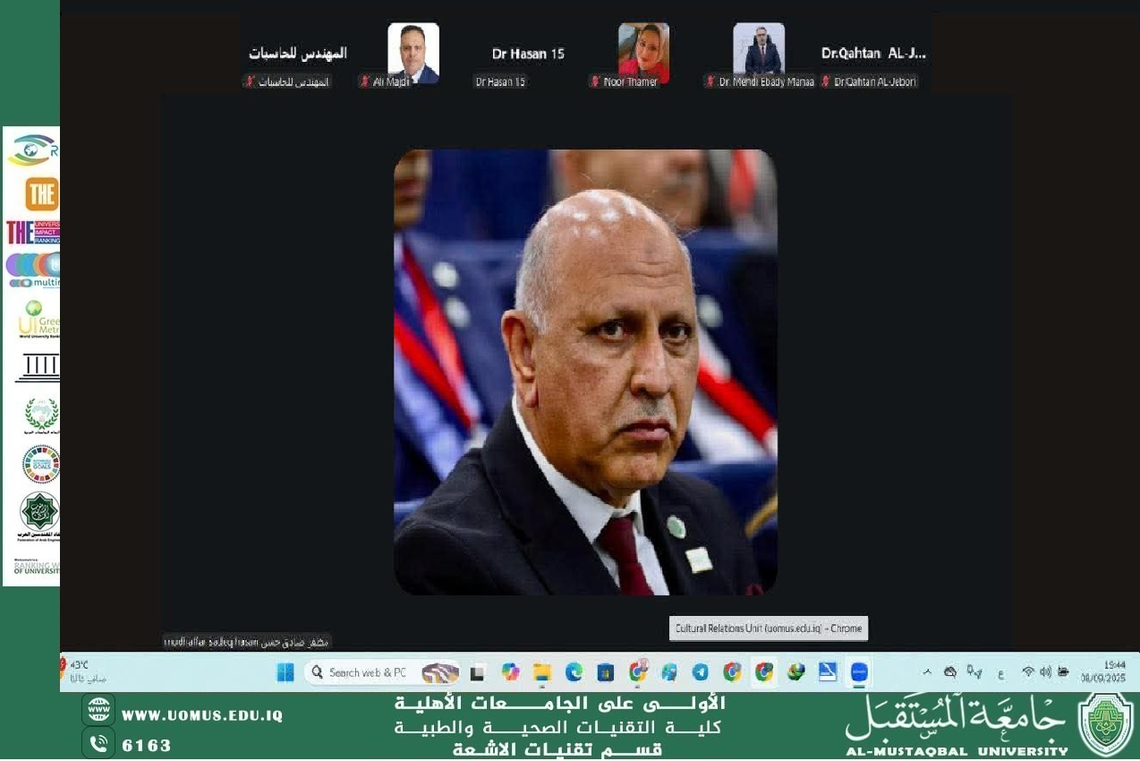 As part of the ongoing preparations for launching the Ambassadors of Al-Mustaqbal for Sustainability camp in early October, the President of Al-Mustaqbal University, Professor Hassan Shaker Majdi, delivered a distinguished lecture via Zoom. He highlighted the importance of this event and its strategic role in strengthening the university’s mission and enhancing its community engagement.