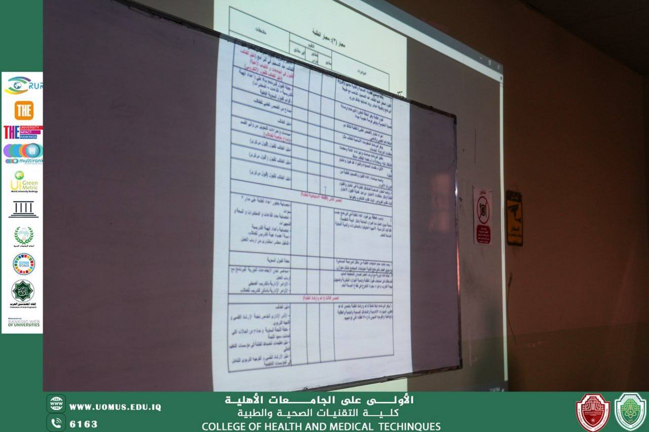 The workshop began with a welcoming speech delivered by the Head of the Department, followed by a lecture presented by Dr. Ahmed Najm, Head of Scientific Affairs in the Department of Radiologic Techniques. During his presentation, he reviewed the department’s plan for implementing program accreditation standards and the mechanisms for their execution to ensure the enhancement of academic program quality.