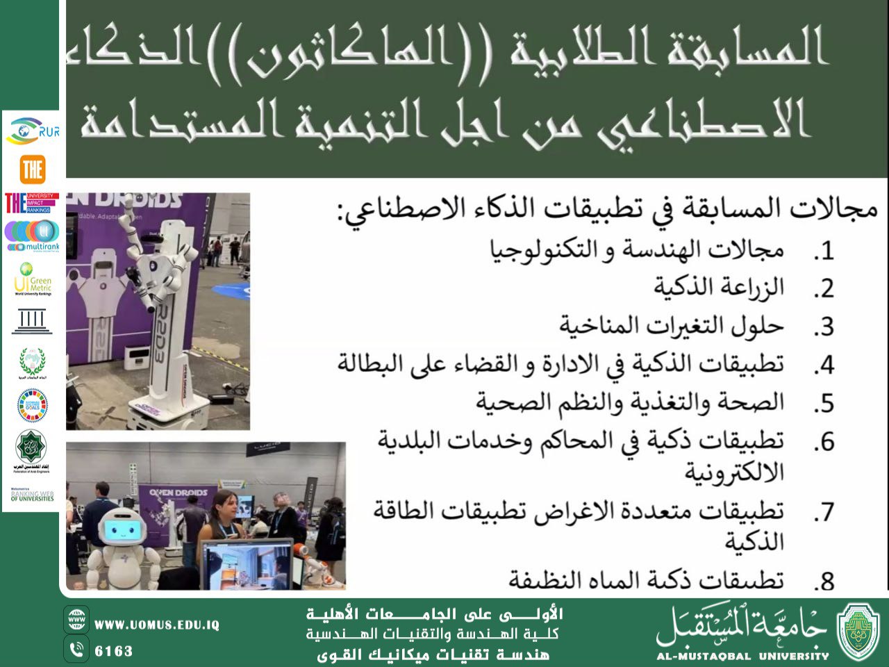 Al-Mustaqbal University, with the active participation of the Department of Power Mechanics Engineering Techniques and under the patronage of the Honorable Governor of Babylon, Prof. Adnan Fayhan Al-Dulaimi, organized the Artificial Intelligence Hackathon Competition.