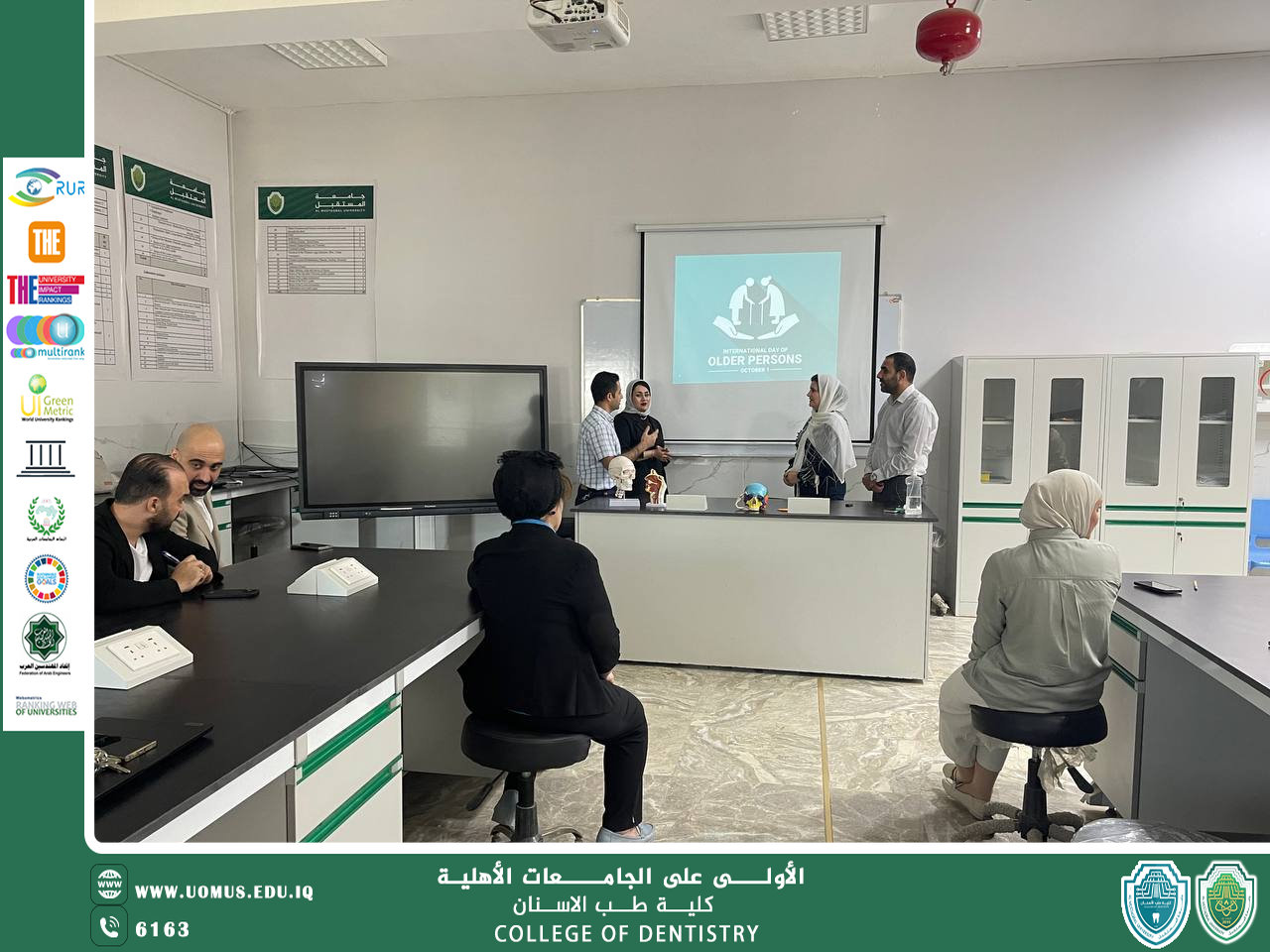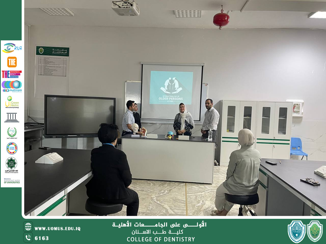 The College of Dentistry at Al-Mustaqbal University organized an awareness seminar on Wednesday, October 1, 2025, in celebration of the International Day of Older Persons, presented by Asst. Lecturer Ali Hamed, Asst. Lecturer Basim Kareem, Asst. Lecturer Hanadi Hadi, and Asst. Lecturer Evan Tahseen.