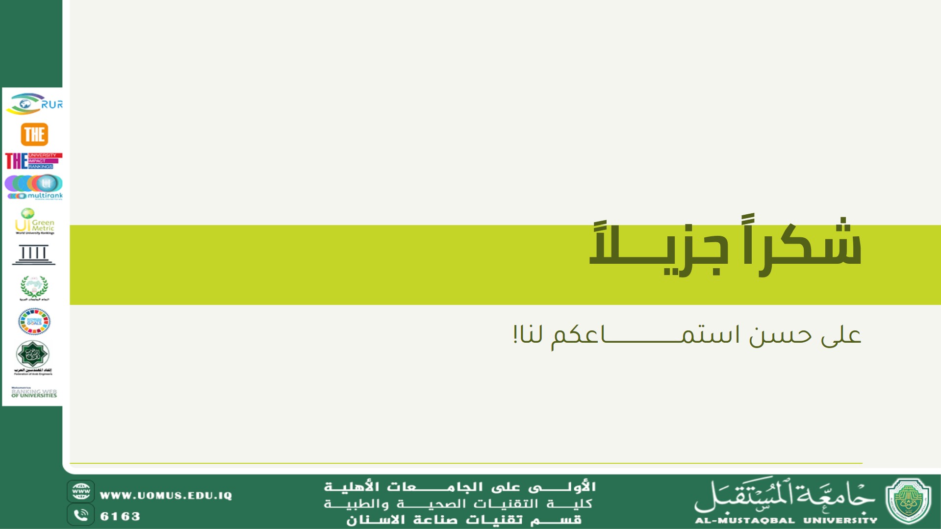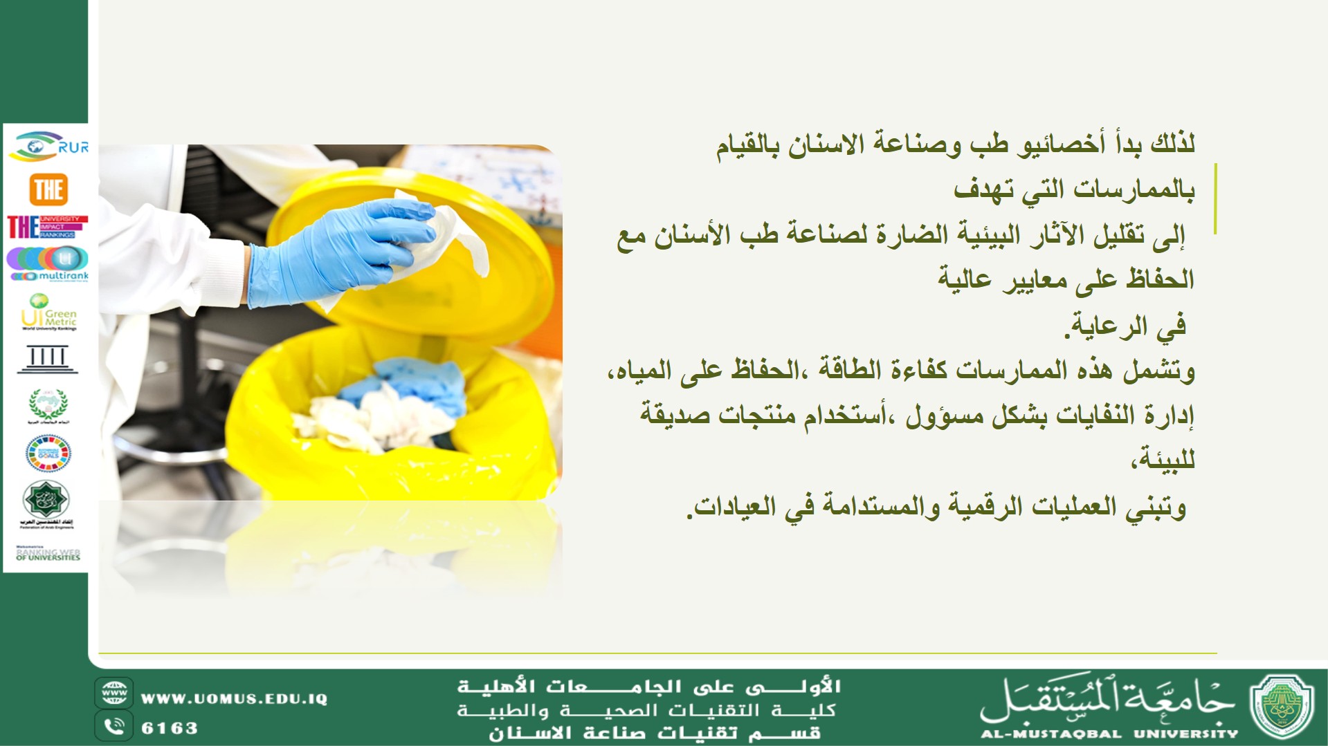 In order to achieve the third goal of sustainable development, which is good health and well-being, the Department of Dental Technology, under the supervision of Mr. (Mr. Mortada Haider Hassan) and Mrs. Aya Khalil Abdullah, conducted an electronic workshop under the title ((Industrial pollution in dental laboratories)) and with the participation of the student ((Ola Kazem Taher))