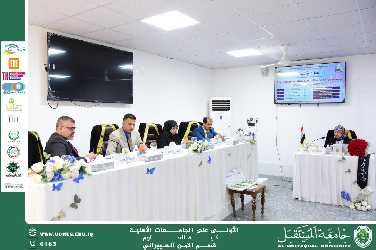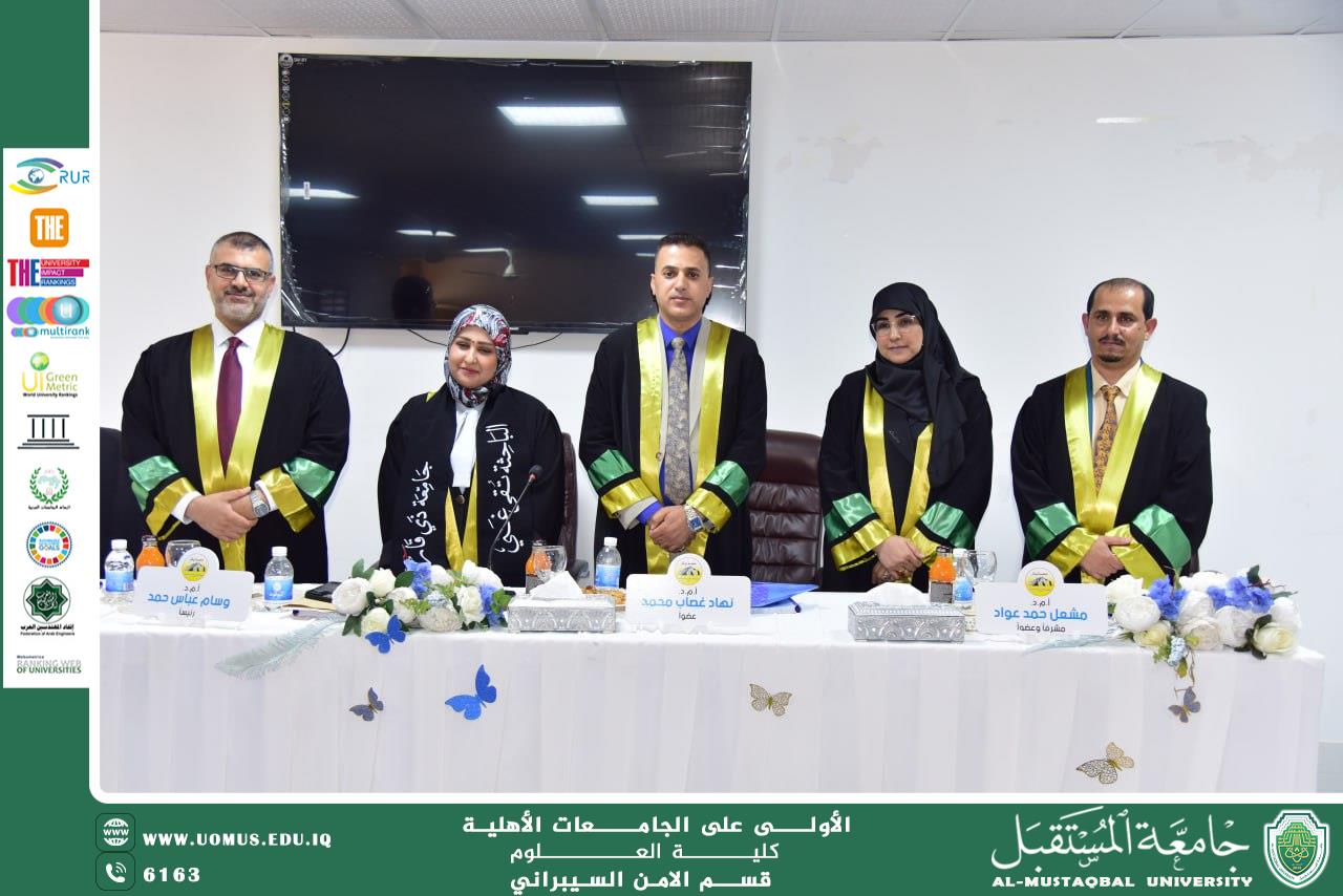 Asst. Prof. Dr. Ali Kadhim Mohammed Al-Ghurabi, Head of the Cybersecurity Department at Al-Mustaqbal University, participated as a member of the examination committee for the Master’s thesis defense of the student Taqa Ghani Treiji at the Department of Computer Science, College of Education for Pure Sciences – University of Thi-Qar.