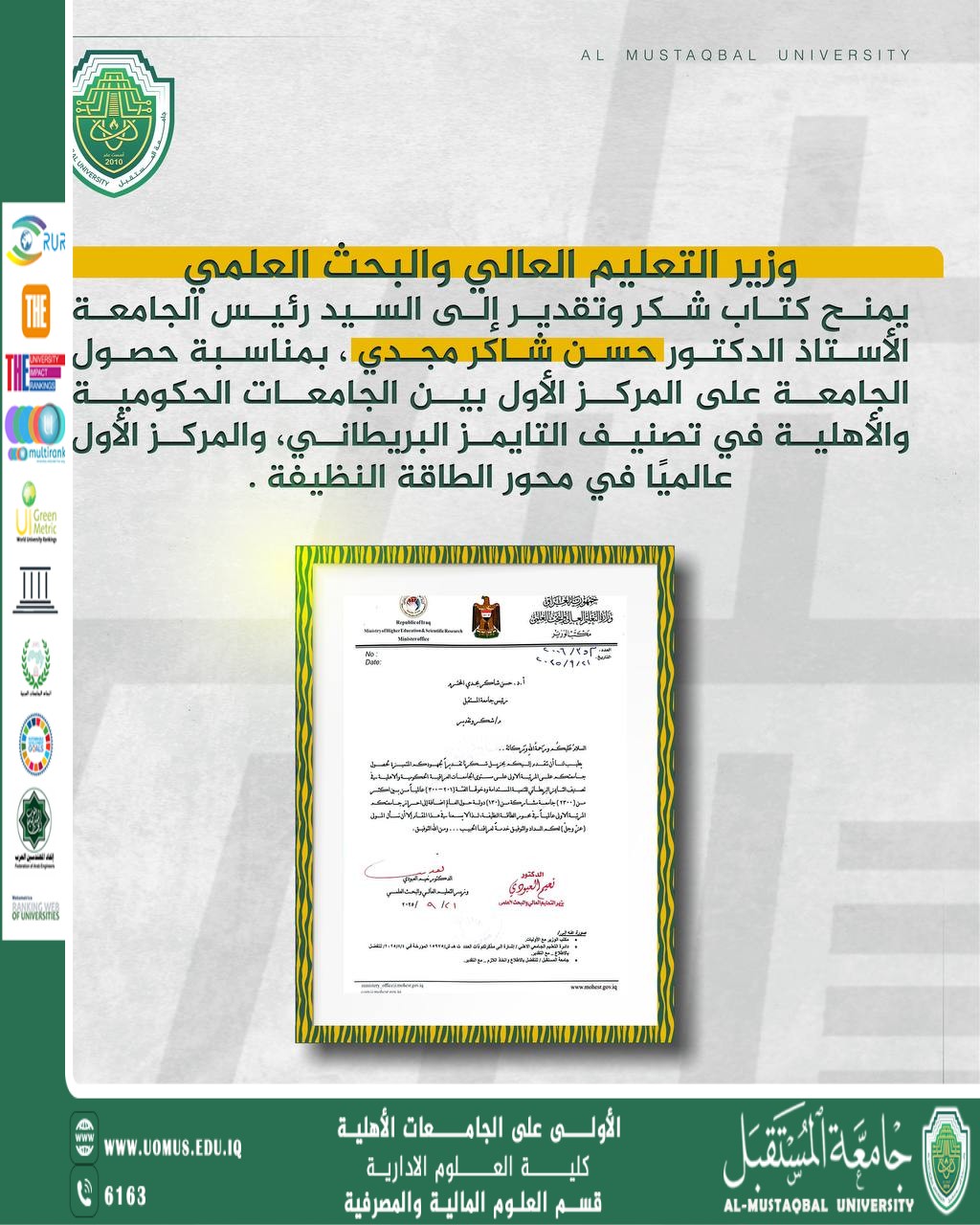 His Excellency the Minister of Higher Education and Scientific Research, Professor Dr. Naeem Al-Aboudi, issued a letter of thanks and appreciation to the President of Al-Mustaqbal University, Professor Dr. Hasan Shaker Majdi, in recognition of the university’s outstanding achievement in securing first place among Iraqi universities in the 2025 Times Higher Education (THE) Sustainable Development Rankings, and its entry into the global (201–300) category out of more than 2,300 universities representing 130 countries.
