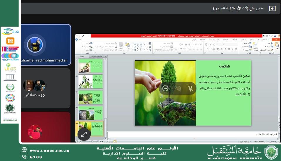 As part of the preparations for the "Future Ambassadors for Sustainability" camp, the Department of Accounting at Al-Mustaqbal University organized an academic workshop entitled: "Ambassadors of Sustainability: Empowering Youth for a Better Future," presented by Assistant Lecturer Hussein Ali Hussein.**
