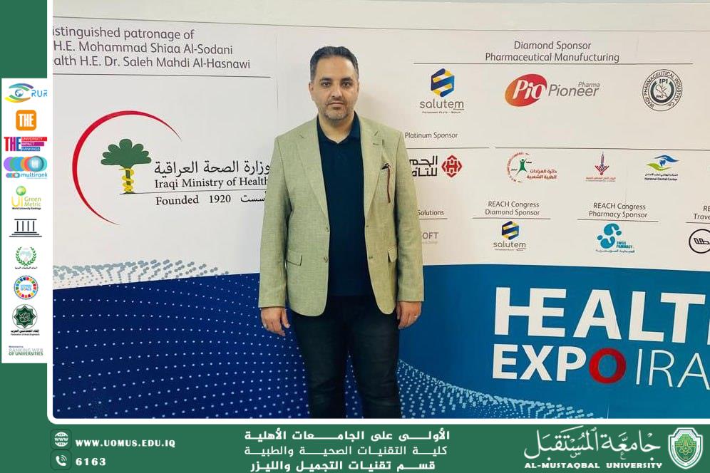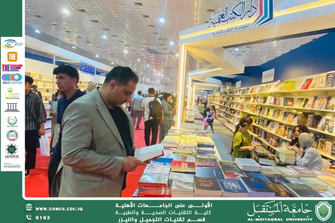 The Associate Dean for Scientific Affairs at the College of Health and Medical Technologies, University of Al-Mustaqbal, Assistant Professor Dr. Ahmed Adnan Al-Khafaji, accompanied by the College Administration Director, Assistant Lecturer Haider Mohammed Nasser, visited the Health and Medical Technologies Pavilion as part of the Baghdad International Book Fair 2025.