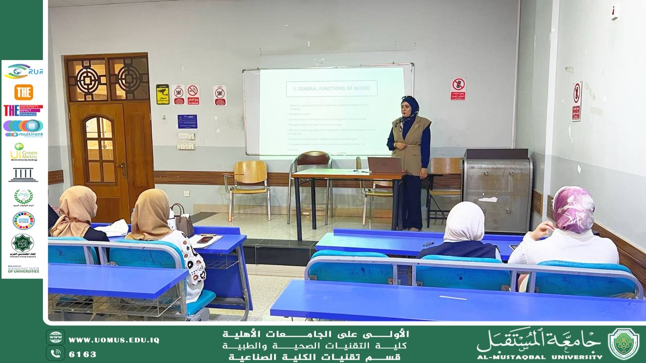 As part of achieving the Sustainable Development Goals, particularly Goal 4 on quality education, lectures in Hematology for second-year students in the Department of Kidney Dialysis Technologies at the College of Health and Medical Technologies – Al-Mustaqbal University, continued under the instruction of Lecturer Zeinab Ali Mohsen.