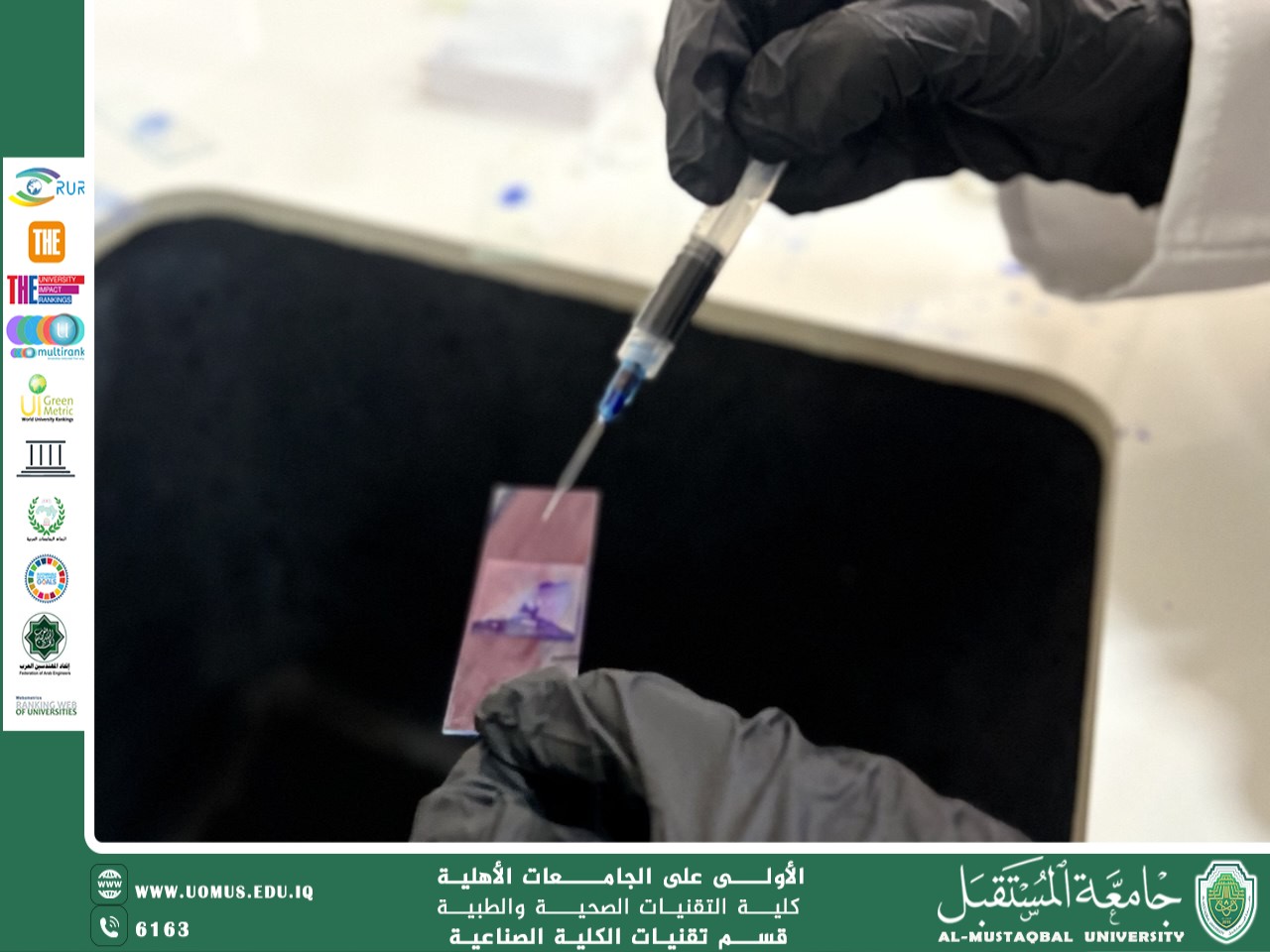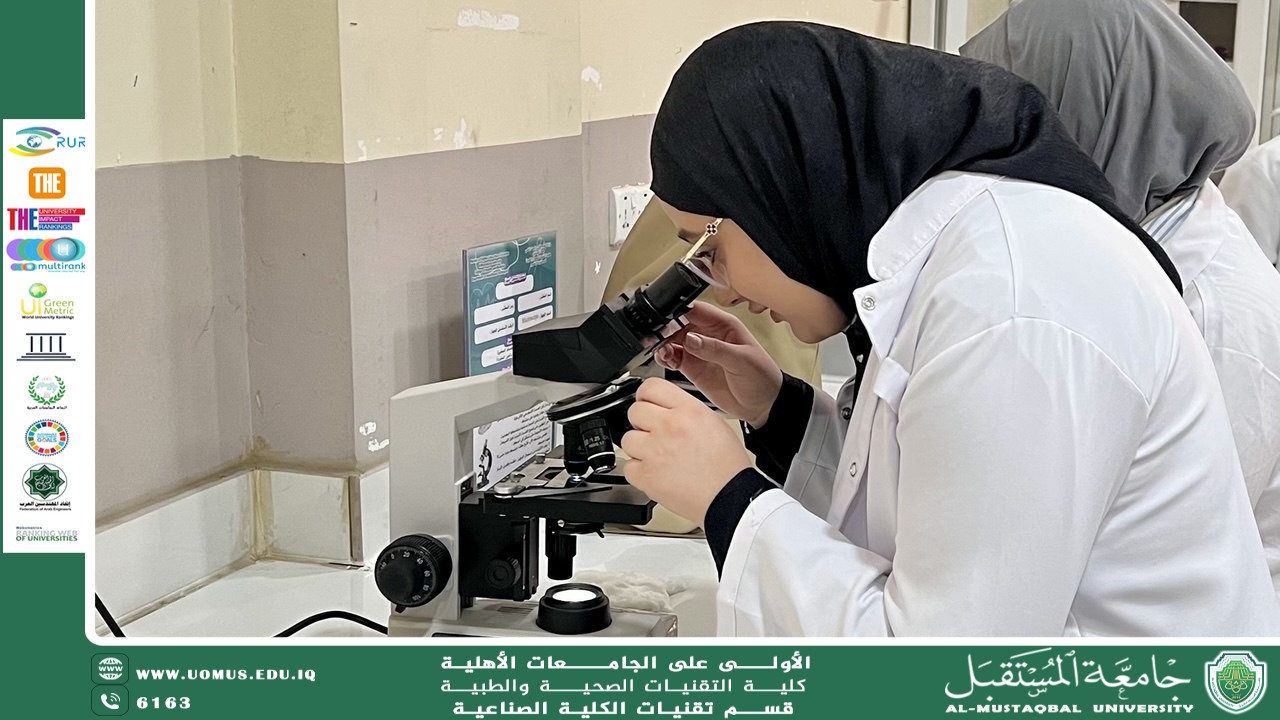 As part of achieving the Sustainable Development Goals, particularly Goal 4, The Department of Industrial Technologies at the College of Health and Medical Technologies – Al-Mustaqbal University, continued delivering practical lectures for second-year students. Assistant Lecturer Zainab Ali Mohsen presented a practical lecture in Hematology.