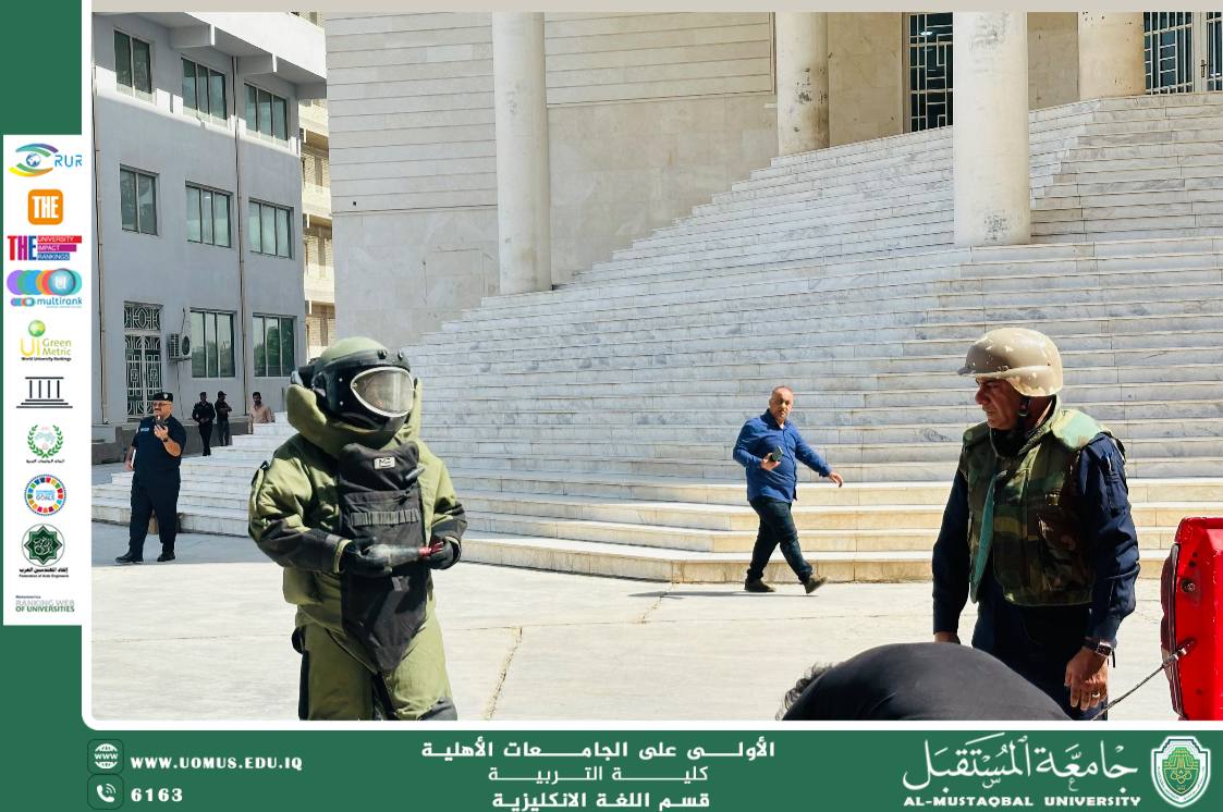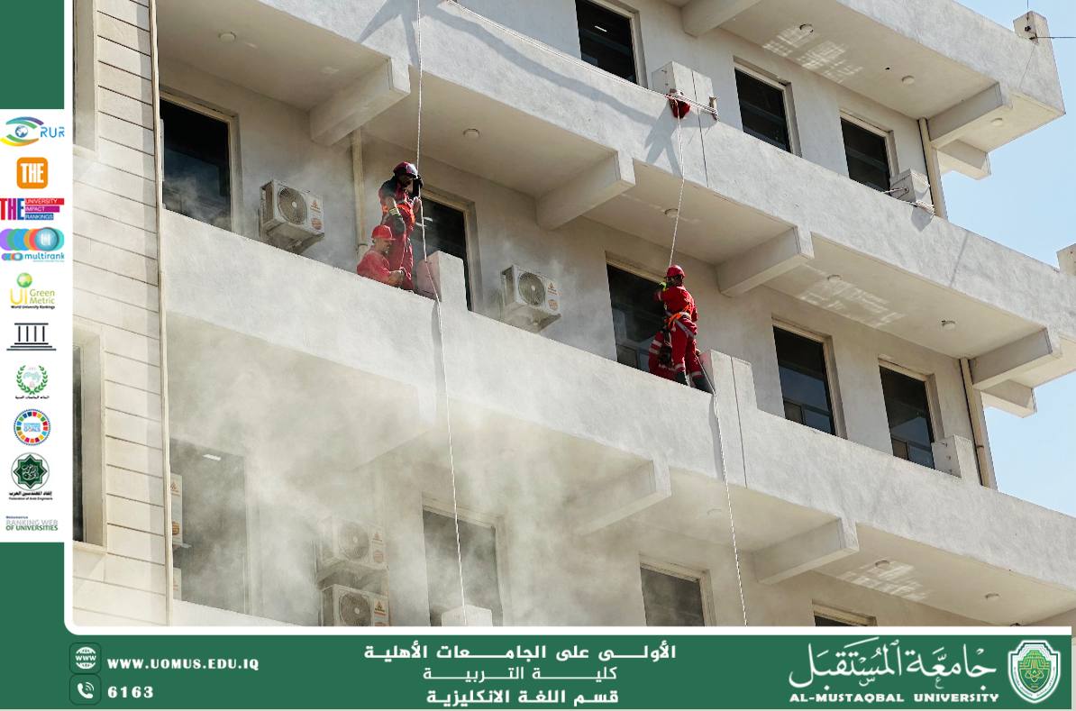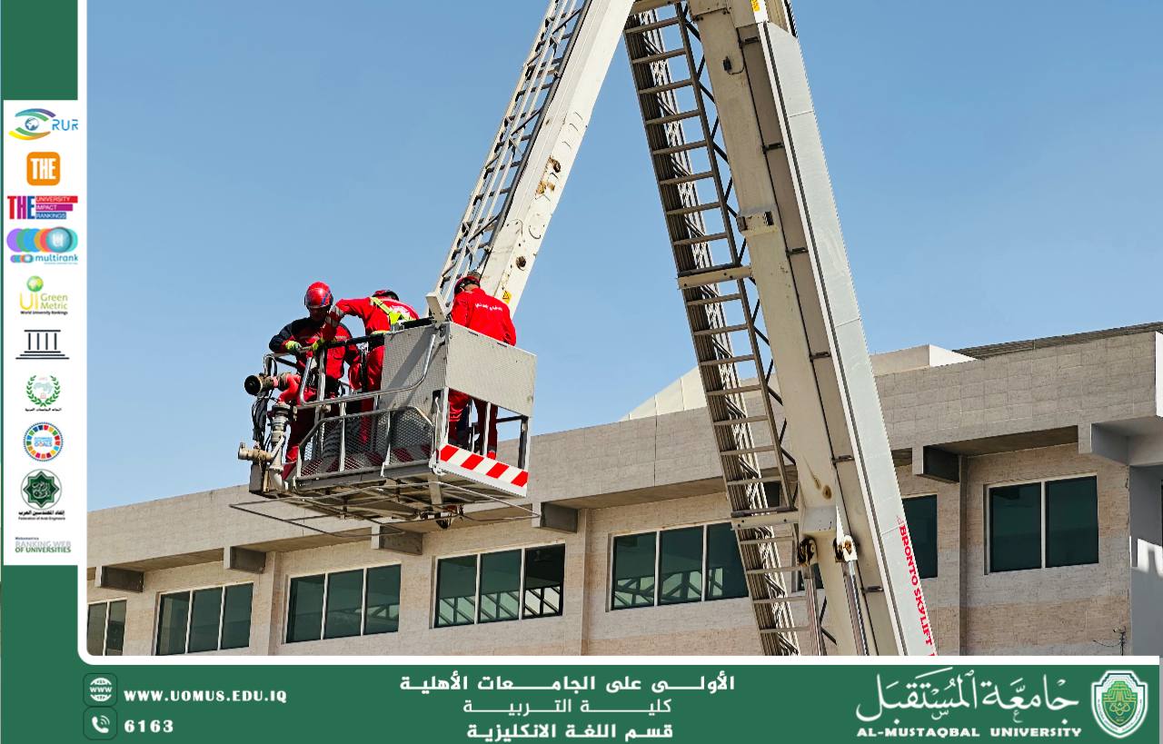 As part of its commitment to promoting safety culture and risk prevention, Al-Mustaqbal University, in cooperation with the Civil Defense Directorate of Babylon, organized an exciting field exercise simulating emergency fire response, attended by the President of Al-Mustaqbal University, Prof. Dr. Hassan Shakir Majdi, along with faculty members, staff, and students.