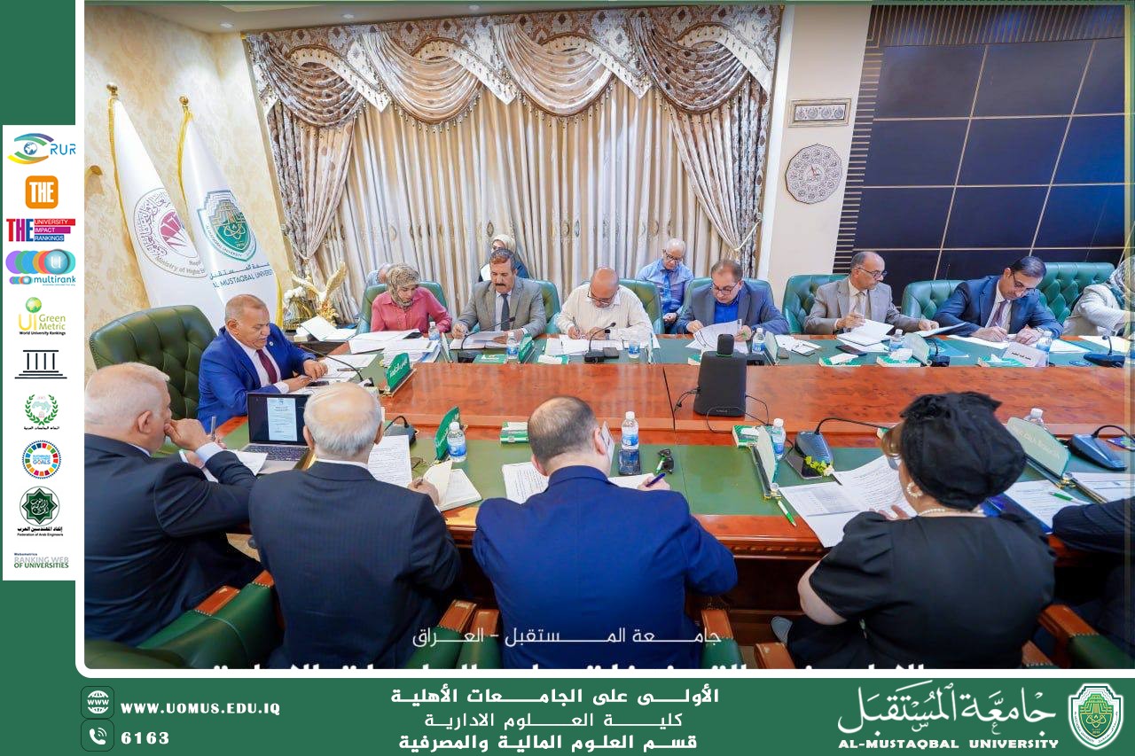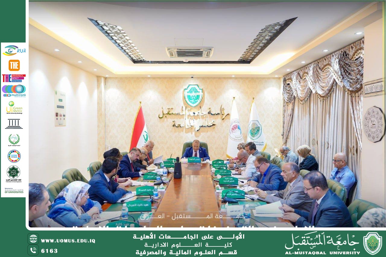 Al-Mustaqbal University Board held its first session for the 2025-2026 academic year today, Monday, September 15, 2025, chaired by Professor Dr. Hasan Shaker Majdi, with the attendance of the university’s assistants, deans of colleges, and council members, to discuss academic, administrative, and technological preparations for the new academic year.