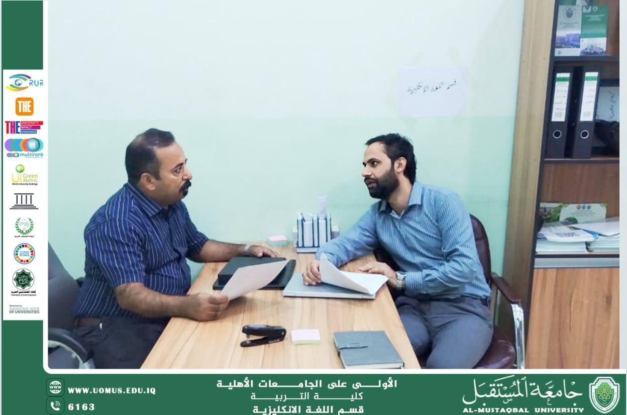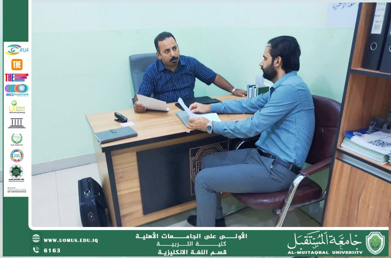 A coordination meeting was held at the College of Education, Al-Mustaqbal University, between the Head of the Quality Assurance Unit at the College, Lecturer Hussein Muneer Abdulzahra, and the Quality Assurance Coordinator of the English Department, Asst. Prof. Ahmed Jundi. The meeting focused on discussing university performance evaluation mechanisms and ways to further develop them in support of the college’s academic and administrative progress.