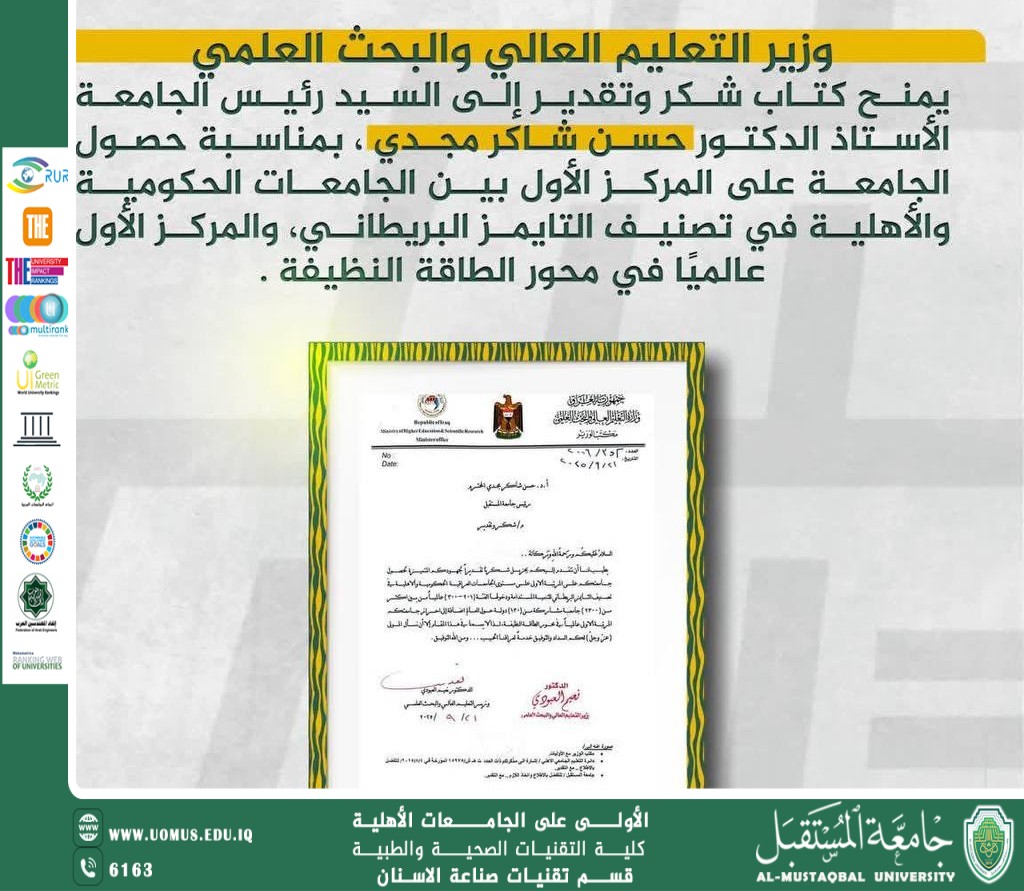 In order to achieve the fourth goal of sustainable development, which is quality education, His Excellency the Minister of Higher Education and Scientific Research, Professor Dr. Naeem Al-Aboudi, addressed a letter of thanks and appreciation to Professor Dr. Hassan Shaker Magdy, President of the University of the Future, in appreciation of his distinguished efforts that resulted in the university achieving a pioneering achievement by obtaining first place.