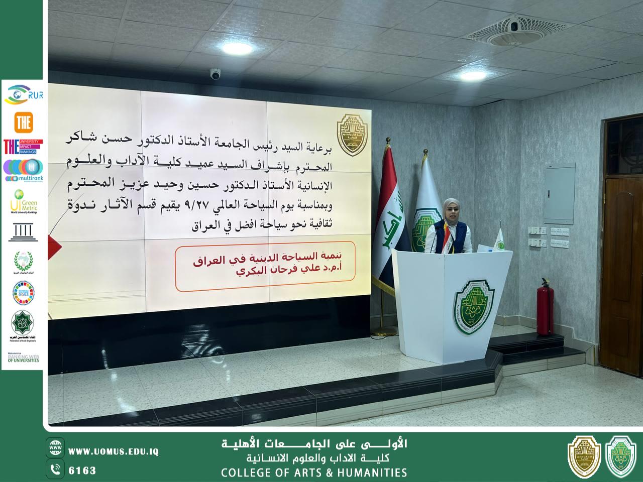 The Dean of the Faculty of Arts attended the scientific symposium held by the college on the occasion of World Tourism Day, which dealt with multiple topics on the importance of tourism in sustainable development and the preservation of cultural and heritage identity. The seminar witnessed the participation of a number of teachers, researchers and students, where they presented research papers and scientific contributions that highlighted the role of academic institutions in supporting and developing the tourism sector in line with the requirements of the times.