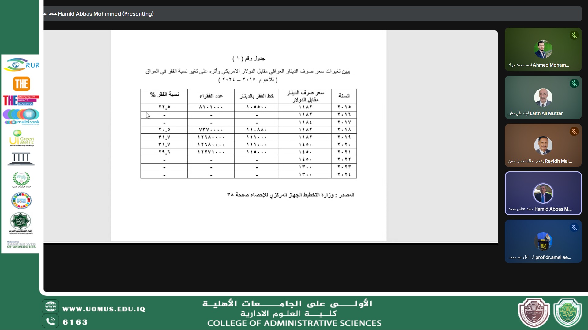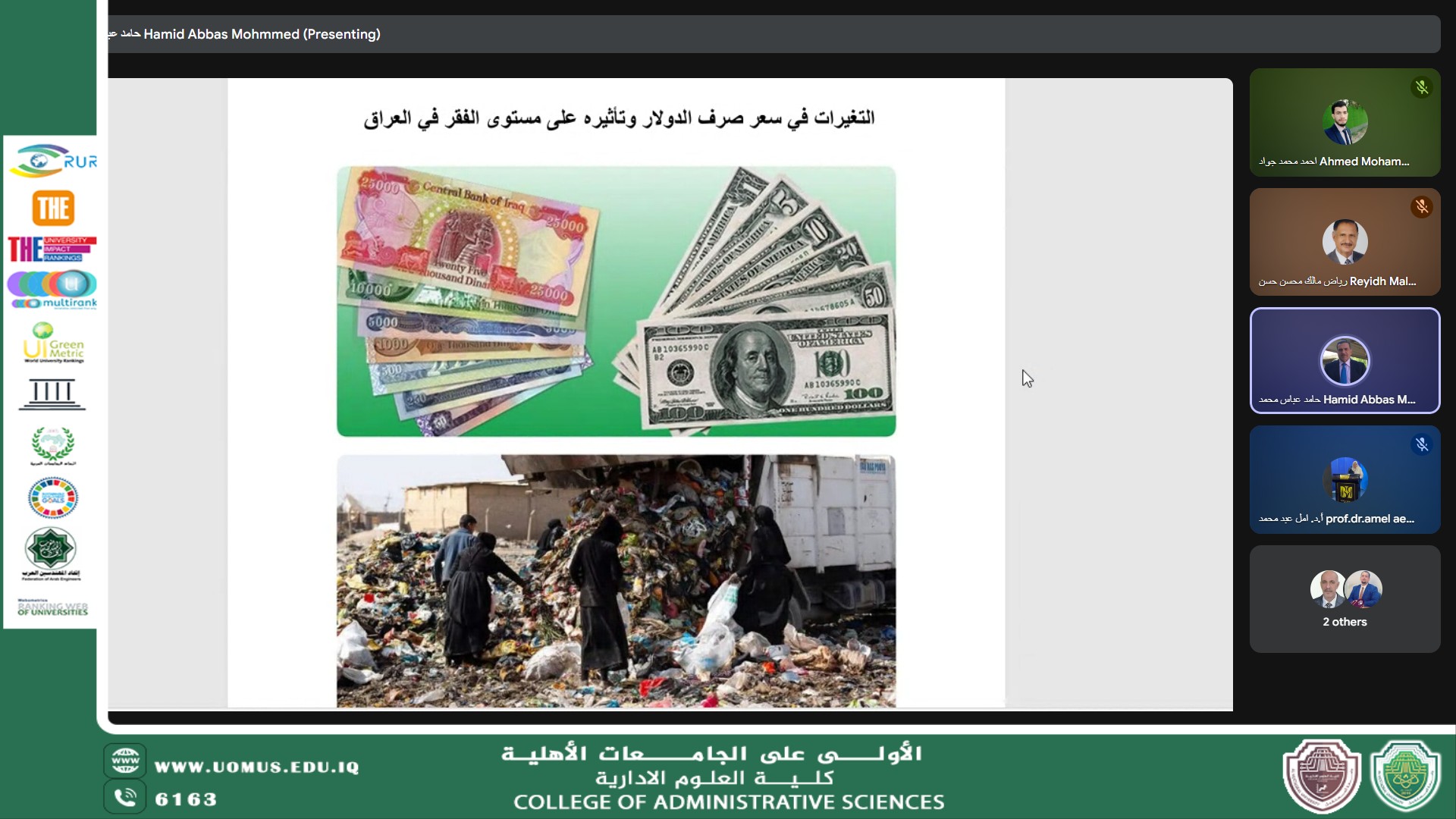 As part of the preparations for hosting the Future Ambassadors for Sustainability Camp, the College of Administrative Sciences at Al-Mustaqbal University organized an academic workshop entitled “The Fluctuations of the Dollar Exchange Rate and Their Impact on the Level of Poverty in Iraq”, delivered by Asst. Prof. Dr. Hamed Abbas Mohammed.