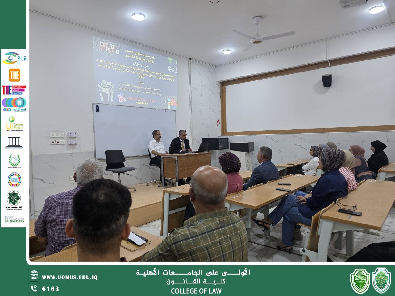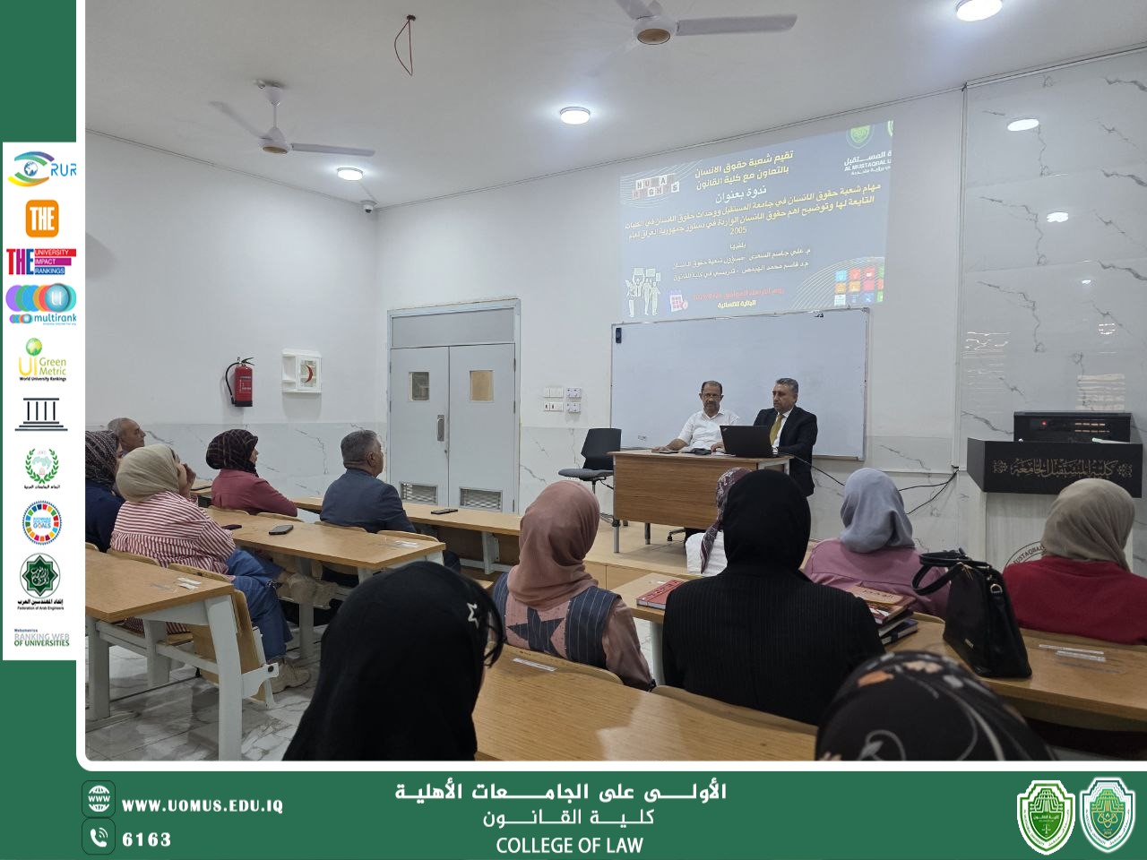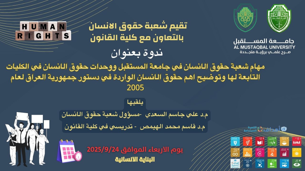 Under the patronage of the President of Al-Mustaqbal University, Prof. Dr. Hassan Shaker Majdi, and under the supervision of the Dean of the College of Law, Prof. Dr. Ammar Abbas Al-Husseini, the College of Law organized an awareness seminar entitled: “Tasks of the Human Rights Division at Al-Mustaqbal University”, on Wednesday, September 24, 2025, at the College Hall – Humanities Building.