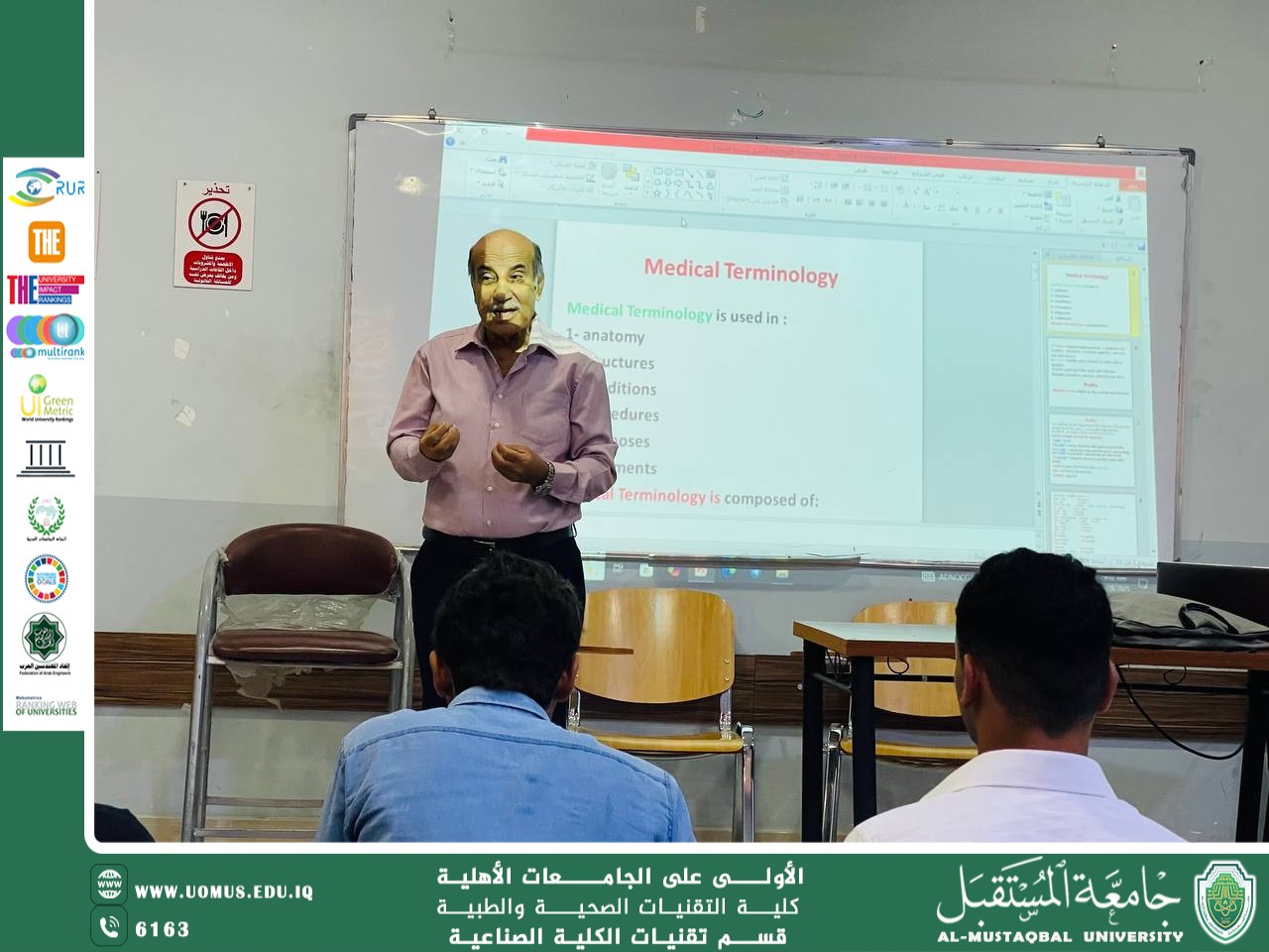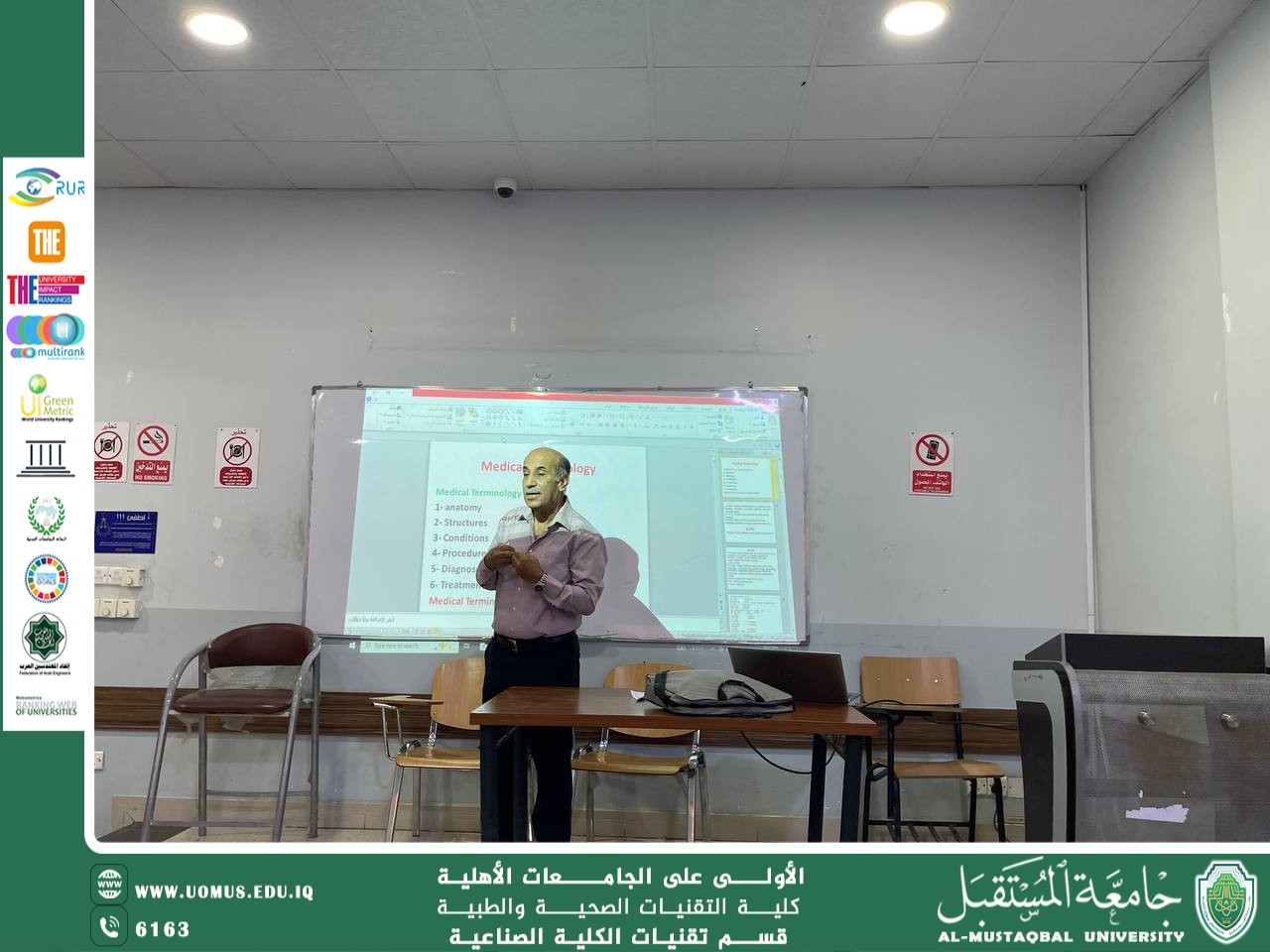 In this context, on Sunday, September 28, 2025, Professor Dr. Talib Jeijan delivered a lecture in Medical Terminology, during which he highlighted the importance of this subject as a fundamental basis for understanding medical and health sciences, and its role in enabling students to use medical language with accuracy and professionalism.