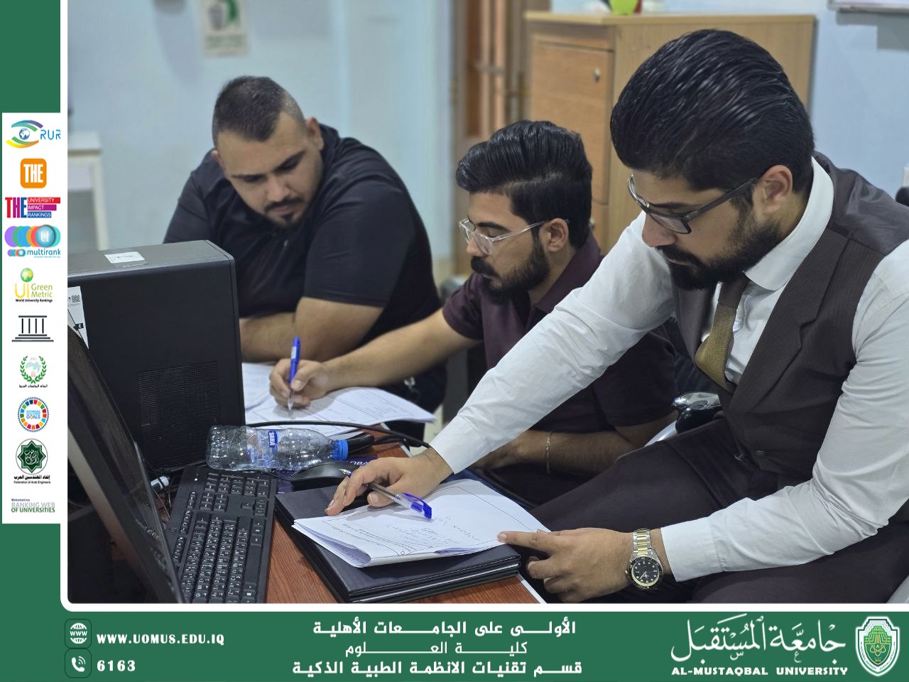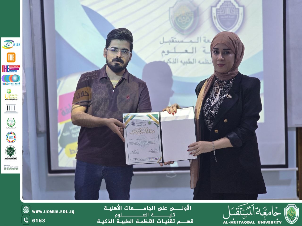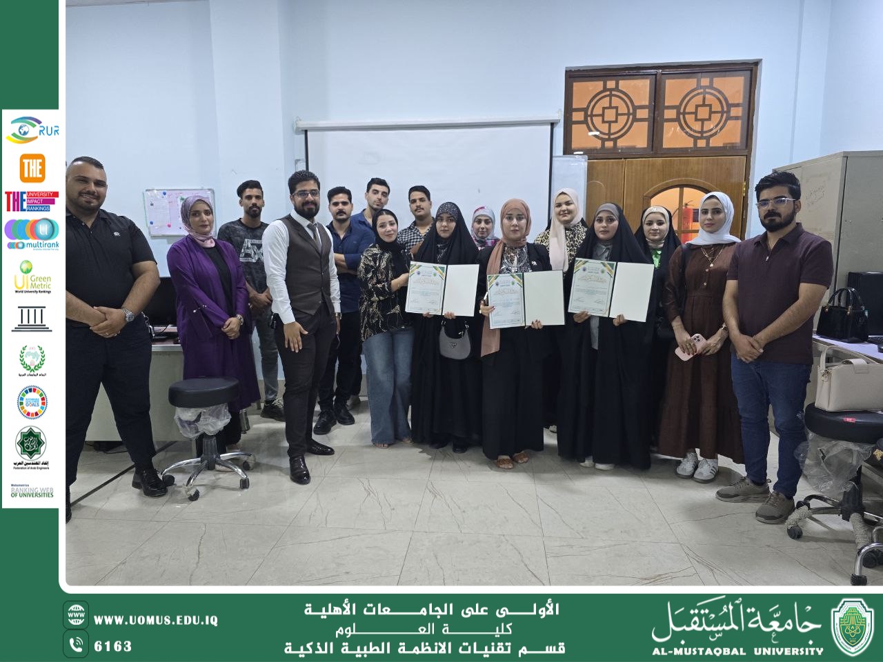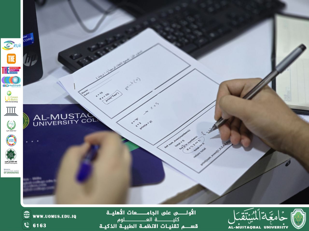 In line with the directives of Al-Mustaqbal University, represented by the University President, Prof. Dr. Hassan Shaker Majdi, to support student creativity and promote research and innovation, the College of Science – Department of Intelligent Medical Systems organized the Think & Code Sprint Hackathon – Think and Code Fast. The event was attended by a group of outstanding students from the department, under the patronage of the respected University President, the Dean of the College of Science, and the Head of the Department of Intelligent Medical Systems, with the supervision of Activities Coordinator Mr. Ali Saleem Haleem.