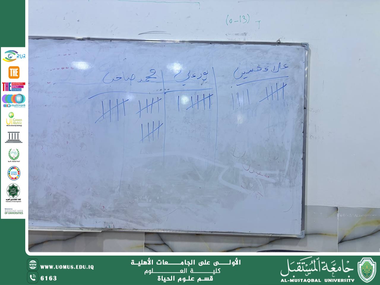 with the direction of the esteemed Dean of the College of Science and under the supervision of the Head of the biology Department (Assistant Professor Jaafar Hamid Jaafar), the second-year student representative elections were held in the biology Department. The candidates for election were students (Alaa Hussein), (Mohammed Sahib), and (Nour Ali). Student (Mohammed Sahib) was selected as the representative of Group B based on the voting results. This is a vital and important process that contributes to enhancing the active participation of students in managing their academic and student affairs and effectively representing their interests.