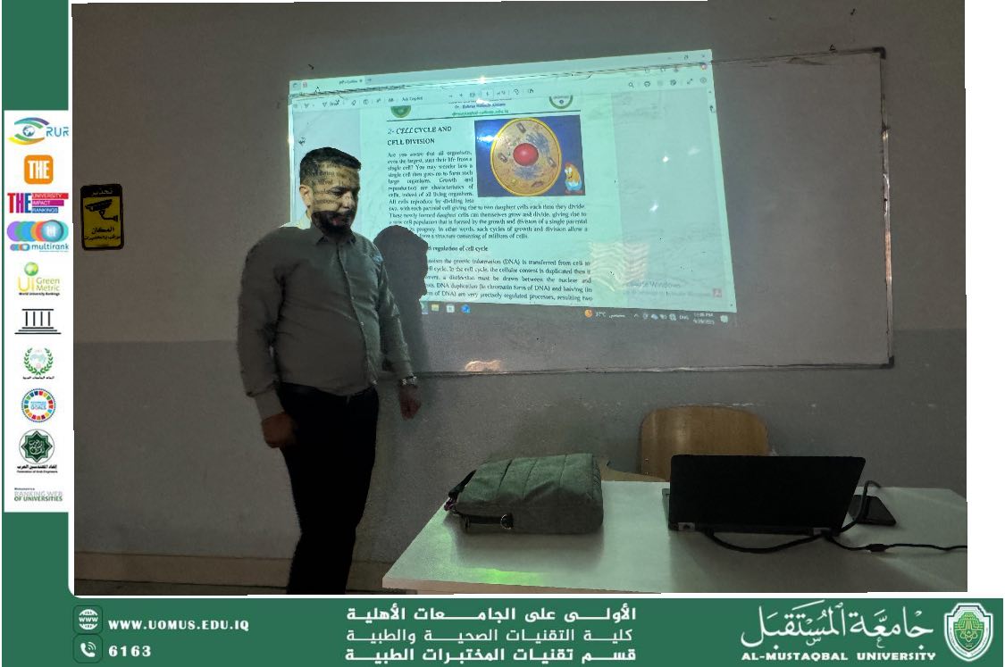 On Monday morning, the Department of Medical Laboratory Techniques at the College of Health and Medical Technologies – Al-Mustaqbal University continued its scientific lectures. The sessions were distinguished by their emphasis on integrating academic knowledge with modern sustainability concepts, particularly the theme of Sustainable Consumption and Production.