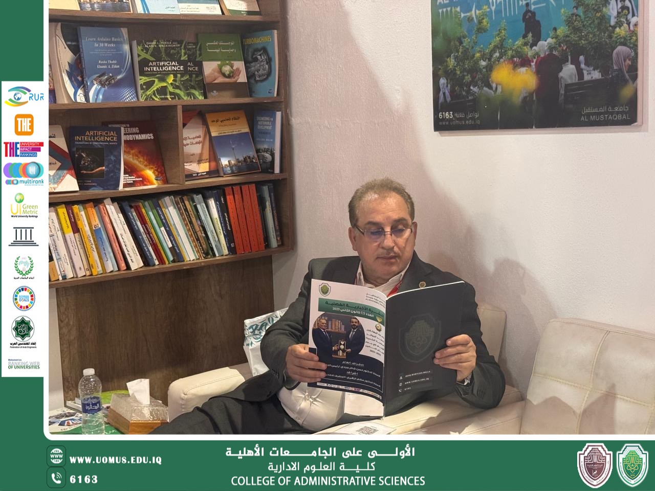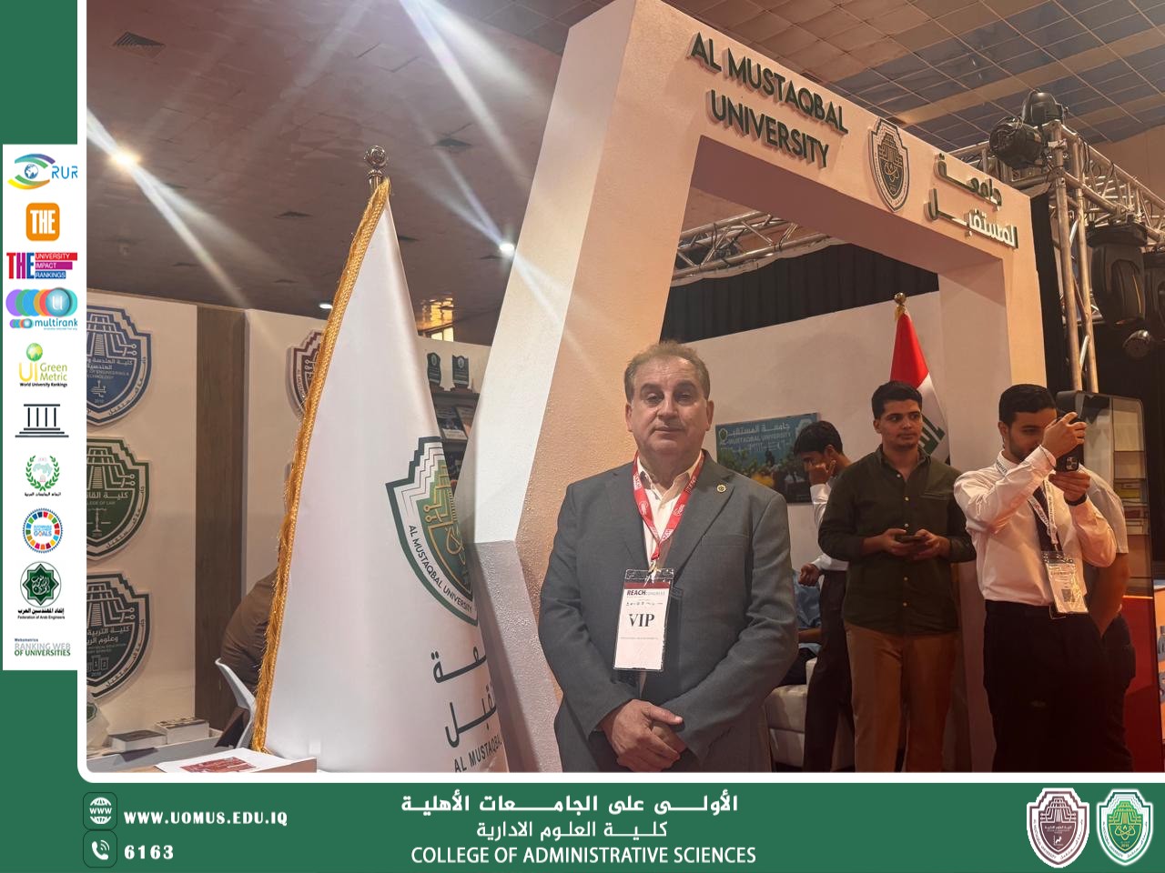 In a distinguished scientific and cultural atmosphere, the Dean of the College of Administrative Sciences, Professor Dr. Haider Ali Al-Dulaimi, accompanied by a number of faculty members, visited the Future University booth at the Baghdad International Book Fair. They viewed the university's pavilion's offerings, including scientific publications that contribute to enhancing academic knowledge and enriching the university library.
