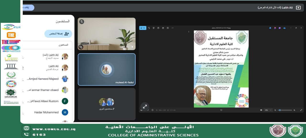 The workshop was delivered by Prof. Dr. Mueyed Abdul-Hussein Al-Fadhl, who addressed the importance of linking education with sustainability issues and enhancing 21st-century skills among students, in a way that empowers them to face future challenges and actively contribute to achieving the Sustainable Development Goals.