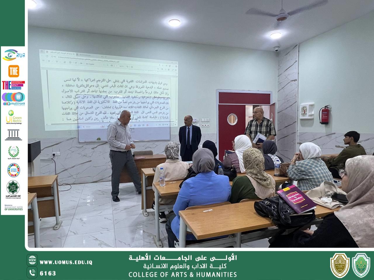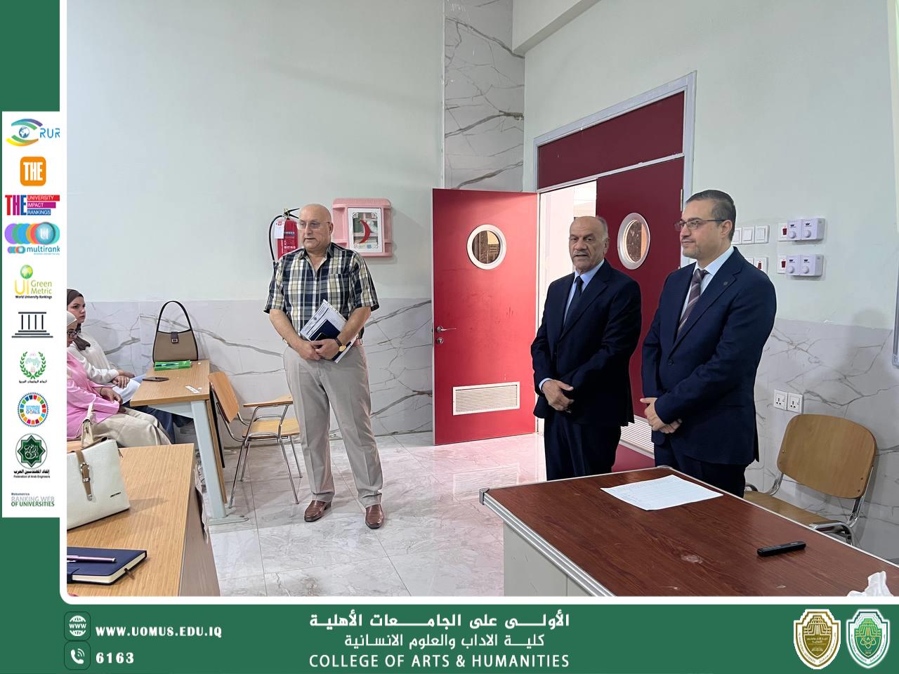 The Dean of the College of Arts, Professor Dr. Hussein Waheed Aziz, accompanied by the Scientific Assistant Professor Dr. Mitham Abdul Khadr Jabbar, inspected the corridors of the college with the start of the new academic year, to see the classrooms and the atmosphere of receiving students, and to follow up on the regularity of lectures and ensure the preparation of the necessary requirements for the educational process. The Dean affirmed the college's keenness to provide a suitable academic environment, praising the efforts of the teaching staff and the administrative staff in making the academic year a success.