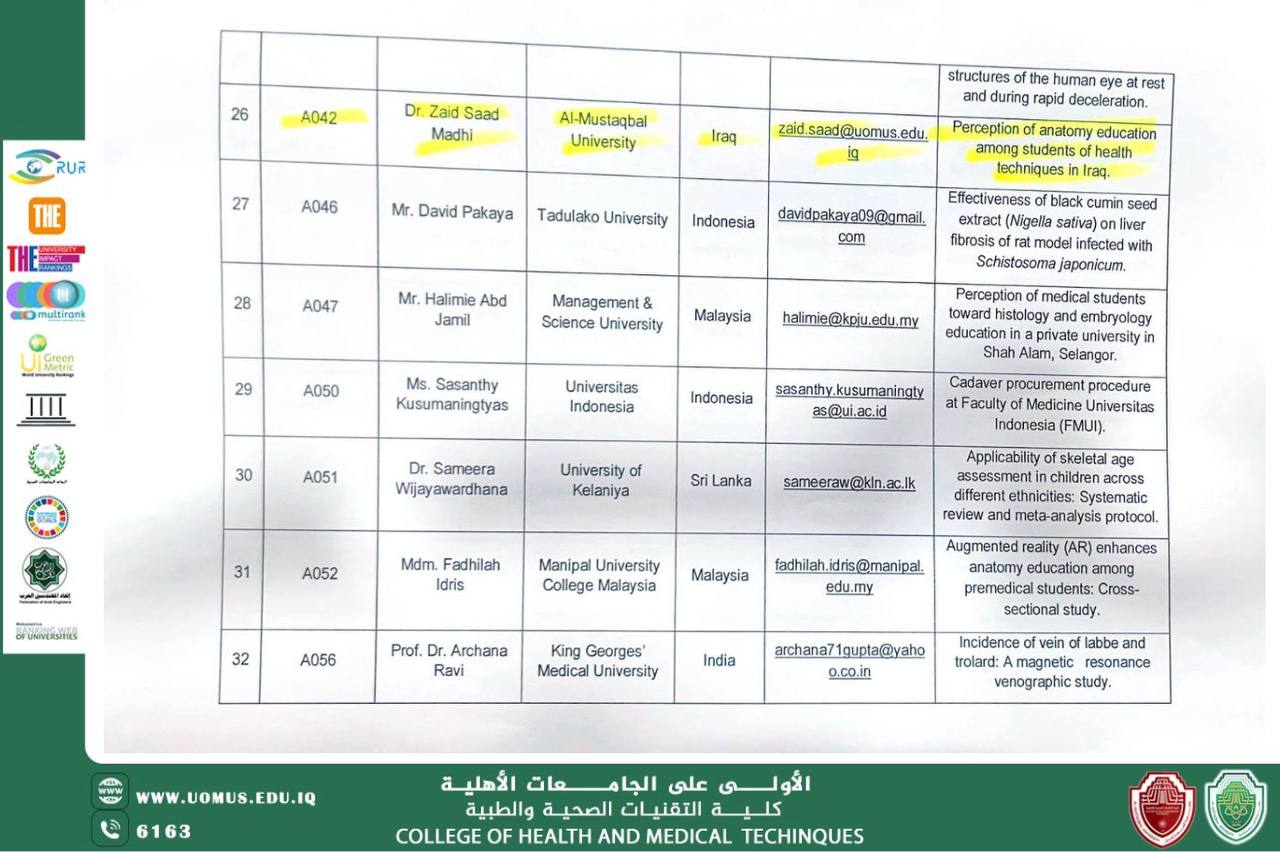 Within the framework of scientific openness and the promotion of international academic collaboration, Asst. Prof. Dr. Ali Shakir Majdi, Associate Dean for Administrative Affairs at the College of Health and Medical Technologies, and Lect. Dr. Zaid Saad Abdul Madi, faculty member in the Department of Radiology at the same college, in collaboration with Prof. Dr. Siti Norma Hamin Hadi, Professor of Medical Education at Universiti Sains Malaysia, presented a distinguished research paper at the 8th Malaysian International Anatomical Association Conference.