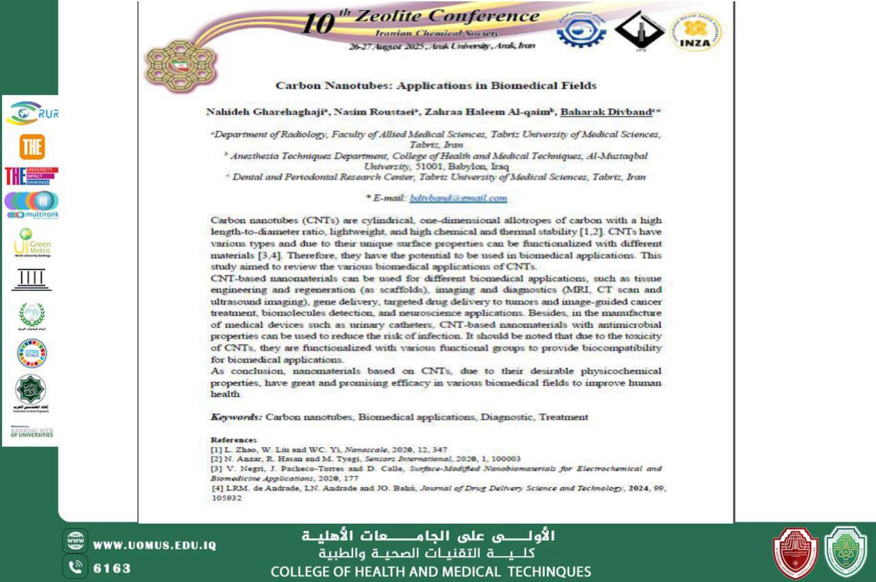 The 10th International Conference on Zewail Studies witnessed a prominent participation from Al-Mustaqbal Private University, represented by the Dean of the College of Health and Medical Technologies, Associate Professor Dr. Zahraa Halim Al-Qayyim. She participated as part of a collaborative research team alongside distinguished faculty members and researchers from the University of Tabriz, Iran. The conference was held at Arak University, Iran, where the presented research addressed the latest scientific advancements in Zewail studies and their advanced applications across medical, industrial, and environmental fields.