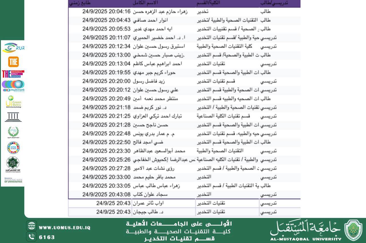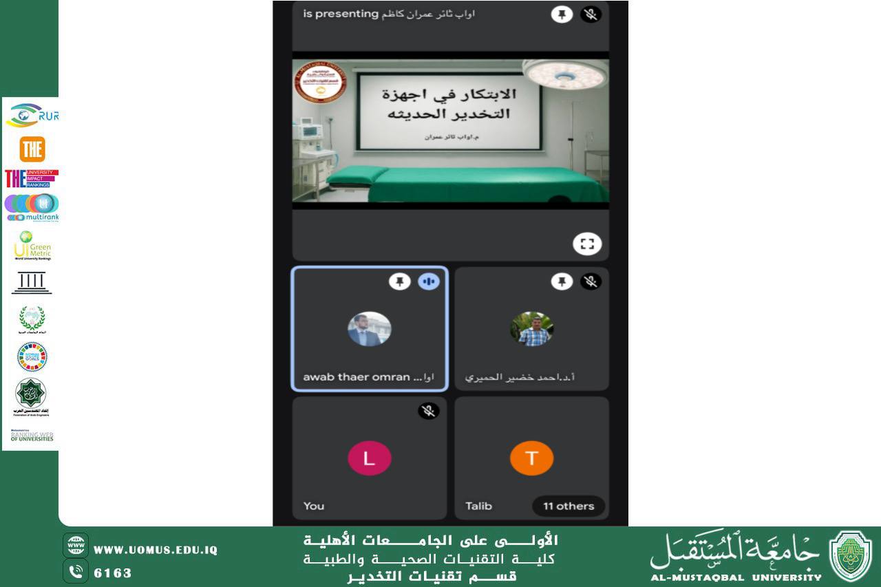 The Department of Anesthesia Techniques, College of Health and Medical Technologies, Al-Mustaqbal University organized a webinar titled “Innovation in Modern Anesthesia Devices” as part of the preparations for the Sustainability Camp, delivered by lecturer Awab Thaer Imran.