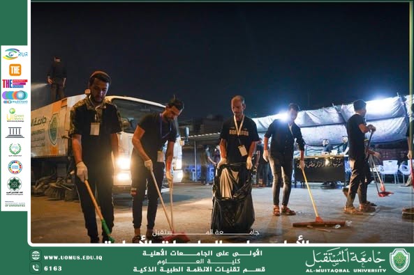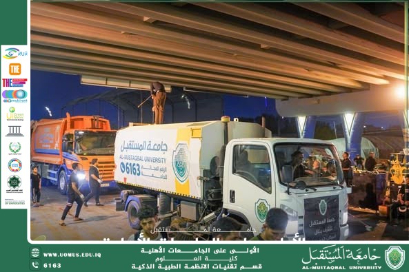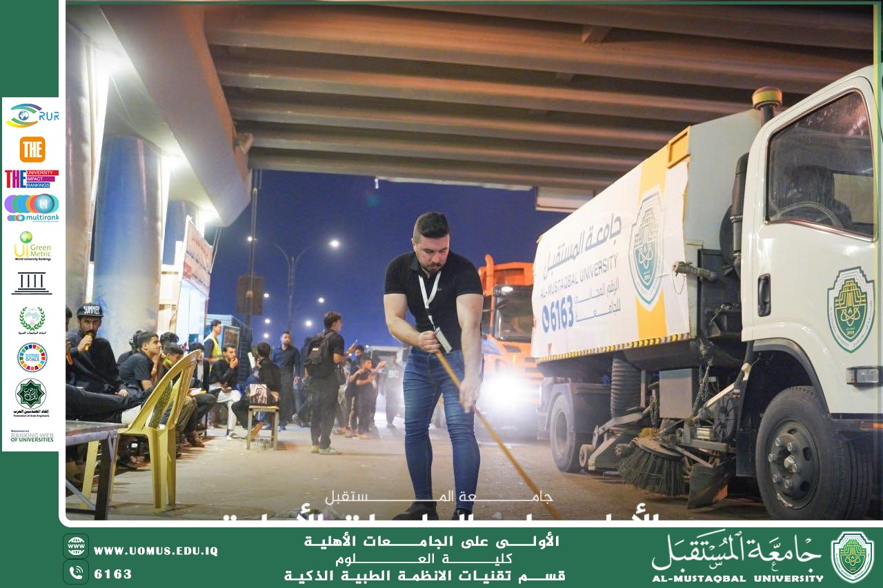 In affirmation of its leading role in serving the community and promoting the culture of volunteerism, the Department of Administrative Affairs at Al-Mustaqbal University launched a large-scale service campaign to clean and prepare the route for the pilgrims of the Arbaeen of Imam Hussein (peace be upon him) along Street 60 in the center of Al-Hilla city, with the participation of the department’s staff and the use of the university’s own machinery and equipment.
