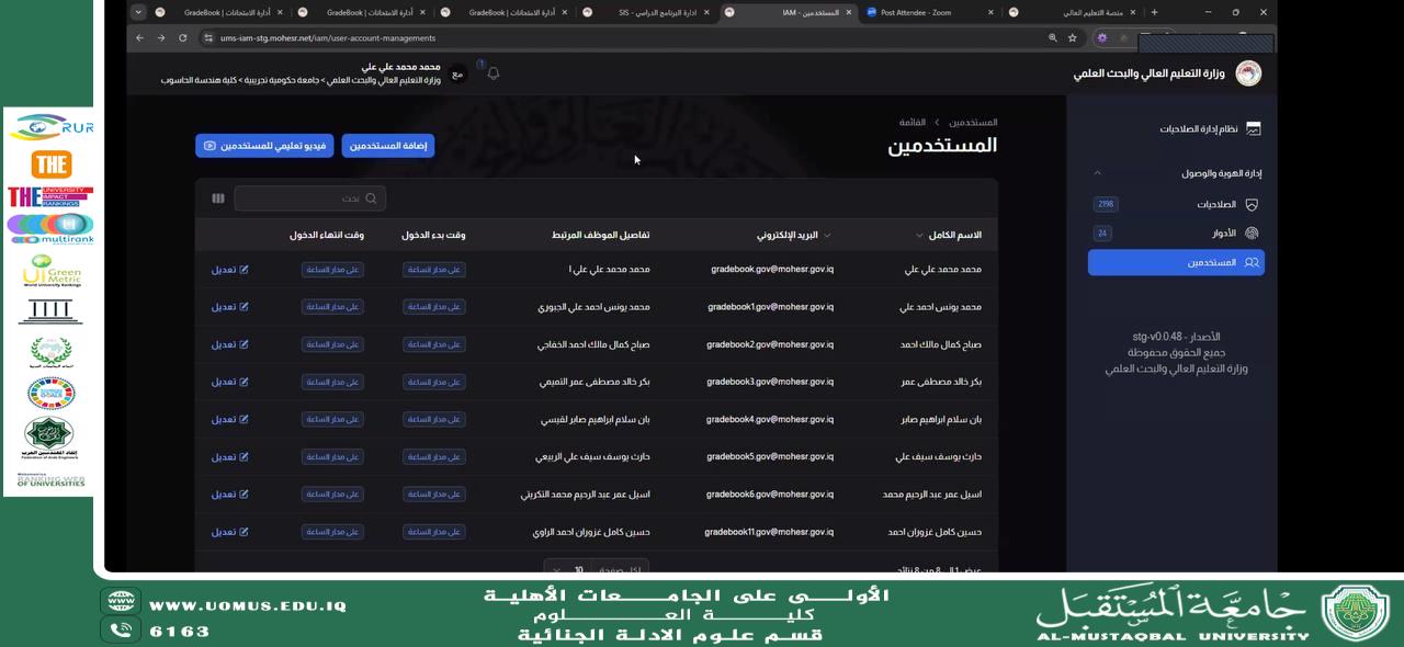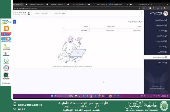 Under the patronage of the respected President of Al-Mustaqbal University, Prof. Dr. Hassan Shaker Majdi, a series of three online workshops was held from Monday, September 29, 2025, until Wednesday, October 1, 2025, to explain the process of uploading students’ data from previous academic years to the SIS system.