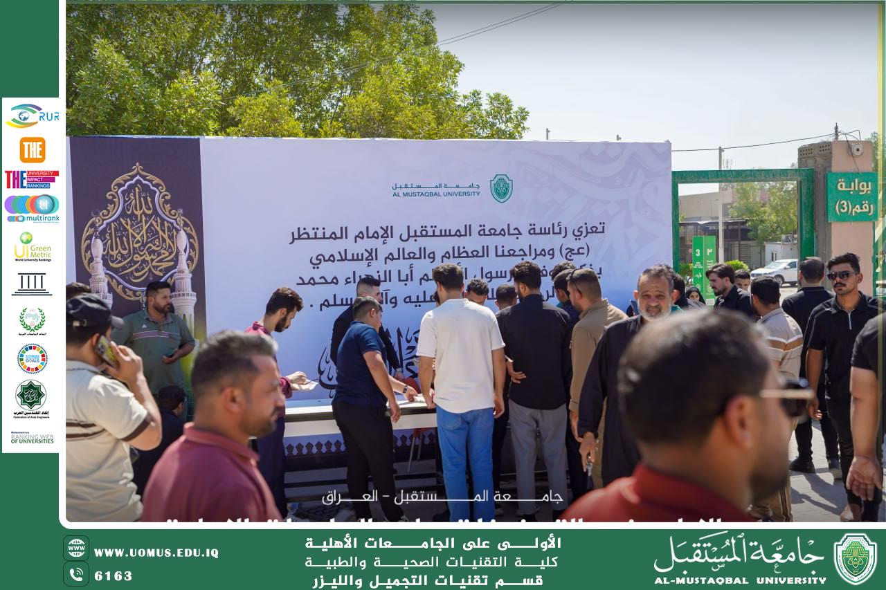 Al-Mustaqbal University commemorated the anniversary of the passing of the Holy Prophet Muhammad (peace be upon him and his family) through a series of humanitarian and cultural activities that reflected the noble values advocated by the Prophet.
