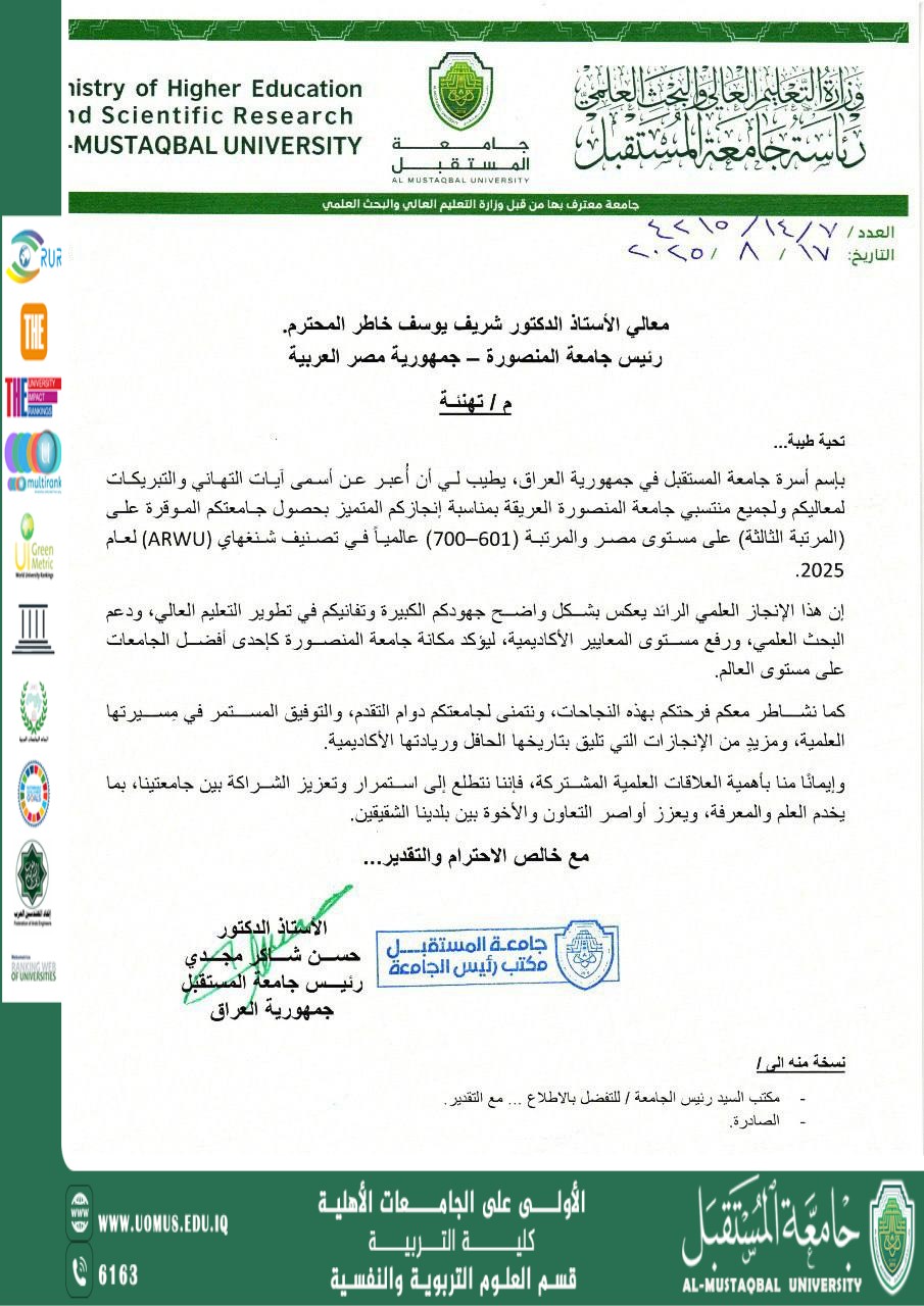 Professor Hassan Shaker Magdy, President of AL_Musstaqbal University in Iraq, extended his sincere congratulations to the President of Mansoura University in the Arab Republic of Egypt on the university's distinguished academic achievement, achieving third place in the Shanghai Ranking of World Universities (ARWU) for 2025, and ranking 601-700 globally.