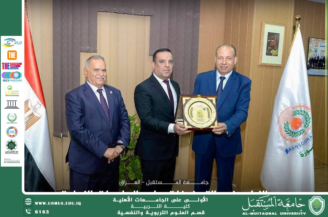 During the signing ceremony, the President of AL_Mustaqbal University emphasized that this protocol represents a pivotal step toward building a solid academic partnership with Mansoura University. He noted that it aligns with the university's institutional strategy of opening up to regional and international universities and developing the higher education environment in Iraq according to the latest international standards. He also expressed his appreciation for the support shown by Mansoura University, congratulating it on its recent achievement in the Shanghai 2025 rankings, ranking third locally and in the 601-700 category globally.