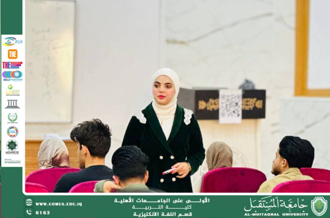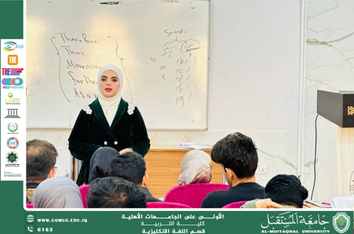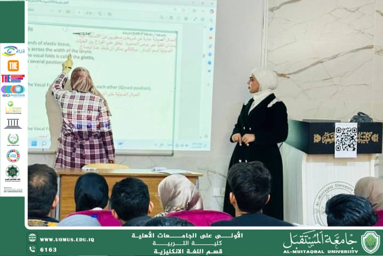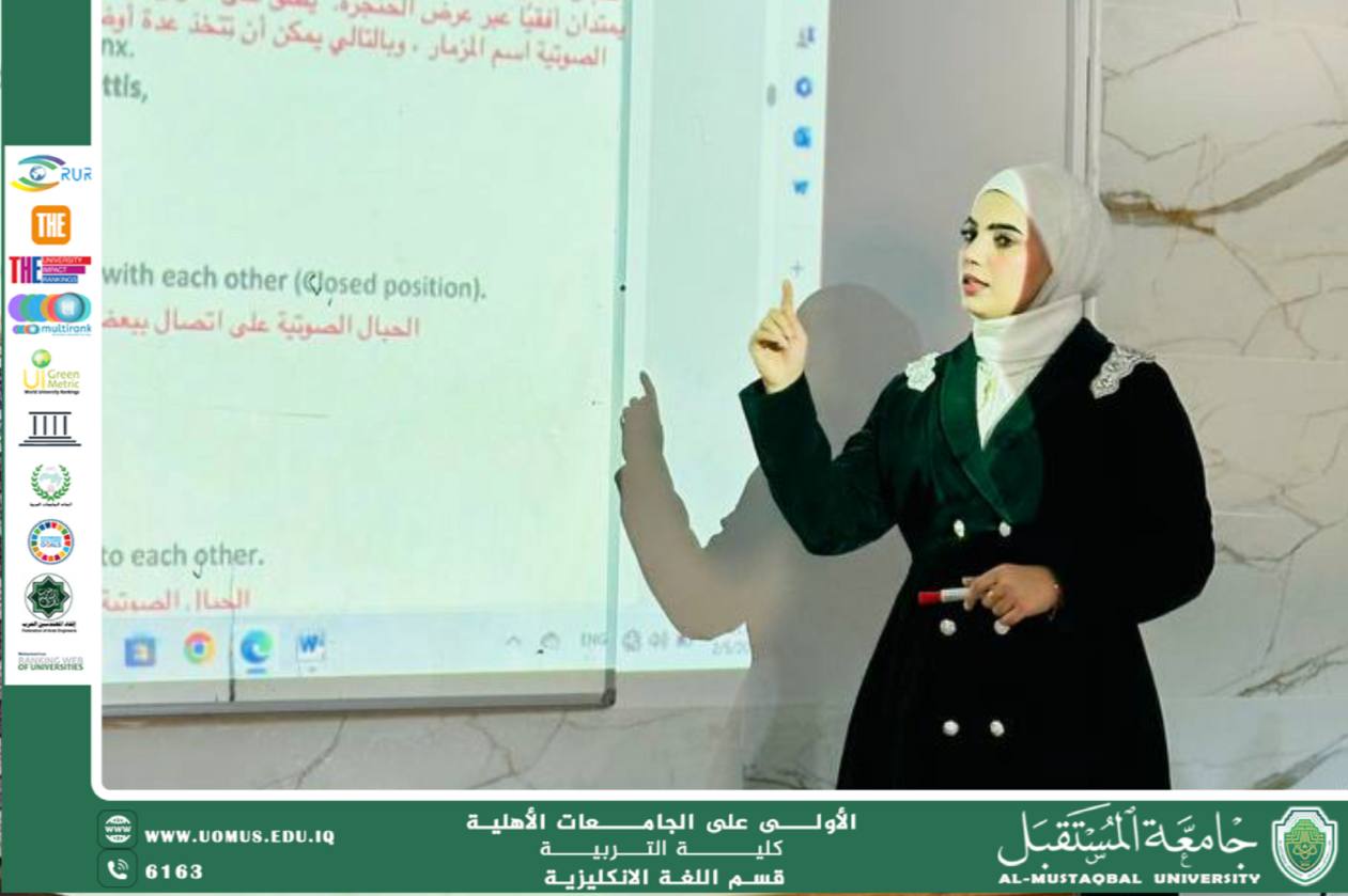 The Department of English at the College of Education, Al-Mustaqbal University, organized a scientific workshop entitled "Understanding the Organs of Speech", delivered by Ms. Estabraq Waleed Atwan, with the attendance of a number of faculty members and students.