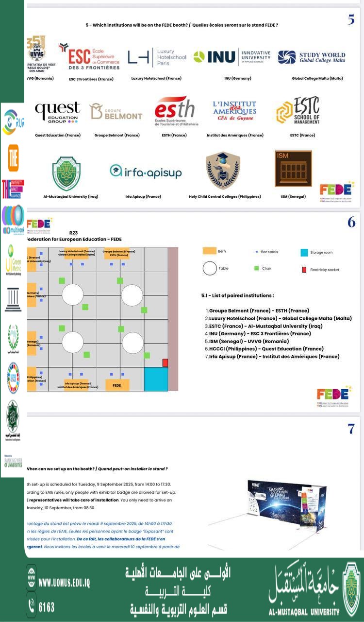 AL_Mustqbal University participated as part of the Federation for European Education (FEDE) pavilion, which the university joined in 2019. It is the only educational institution from the Middle East represented at this global academic forum, alongside a select group of universities and educational institutions from Europe, Africa, and Asia.