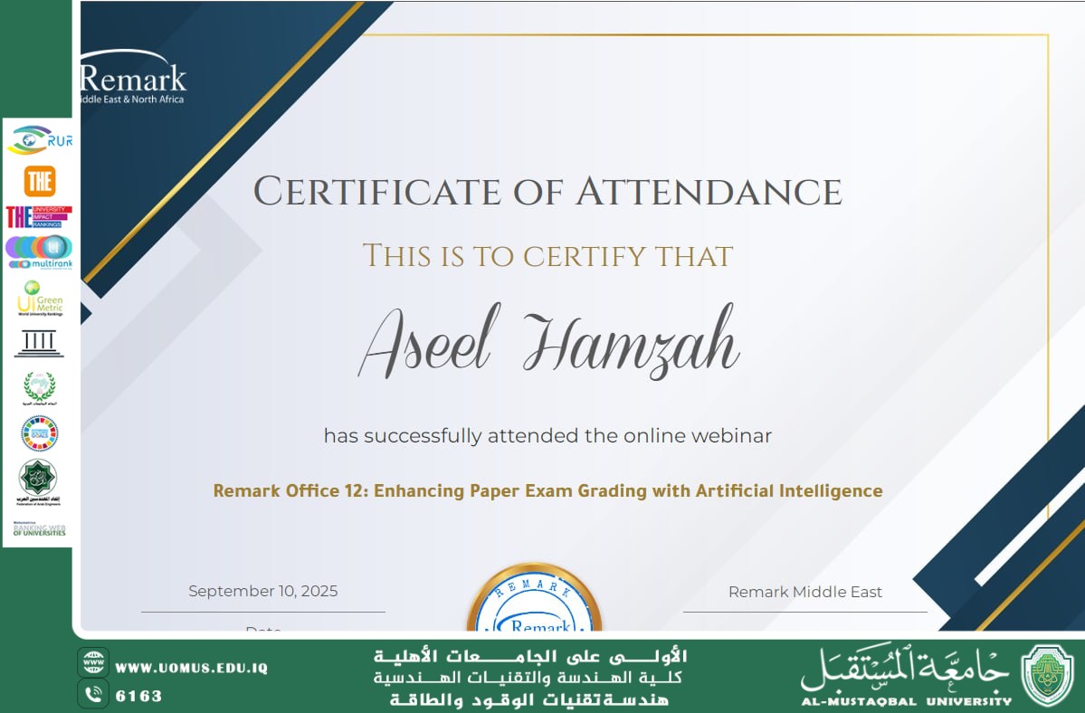 Dr. Aseel Safi Hamzah Receives Certificate of Participation in a Specialized Webinar on Enhancing Ed...