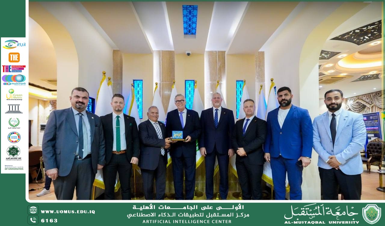 On Wednesday, September 17, 2025, Prof. Dr. Hassan Shaker Majdi, President of Al-Mustaqbal University, welcomed a senior medical and academic delegation from Hannover Medical University, Germany, accompanied by Prof. Dr. Walaa Louay Al-Fallouji, Dean of the College of Medicine. The delegation included German specialists in complex surgeries and cardiac catheter interventions, working at Hannover University Hospital, one of the top five teaching hospitals in Germany. The hospital provides high-level medical services, academic programs, professional training, and conducts advanced research in organ transplantation, stem cells, regenerative medicine, infectious diseases, and advanced surgical techniques. The visit began with a tour of the university facilities, including the College of Medicine building, the nature reserve, the Solar Energy Research Center, the Sustainable Arab House, and the guest house, during which discussions focused on enhancing scientific and academic cooperation and expanding joint research opportunities. At the conclusion of the visit, the German delegation expressed their admiration for the university’s comprehensive academic and developmental achievements and outlined their aspirations to strengthen collaboration in academic exchanges, expertise sharing, and student and faculty visits, contributing to enhanced academic and medical quality and reinforcing the university’s regional and international standing. Al-Mustaqbal University is the leading private university in Iraq
