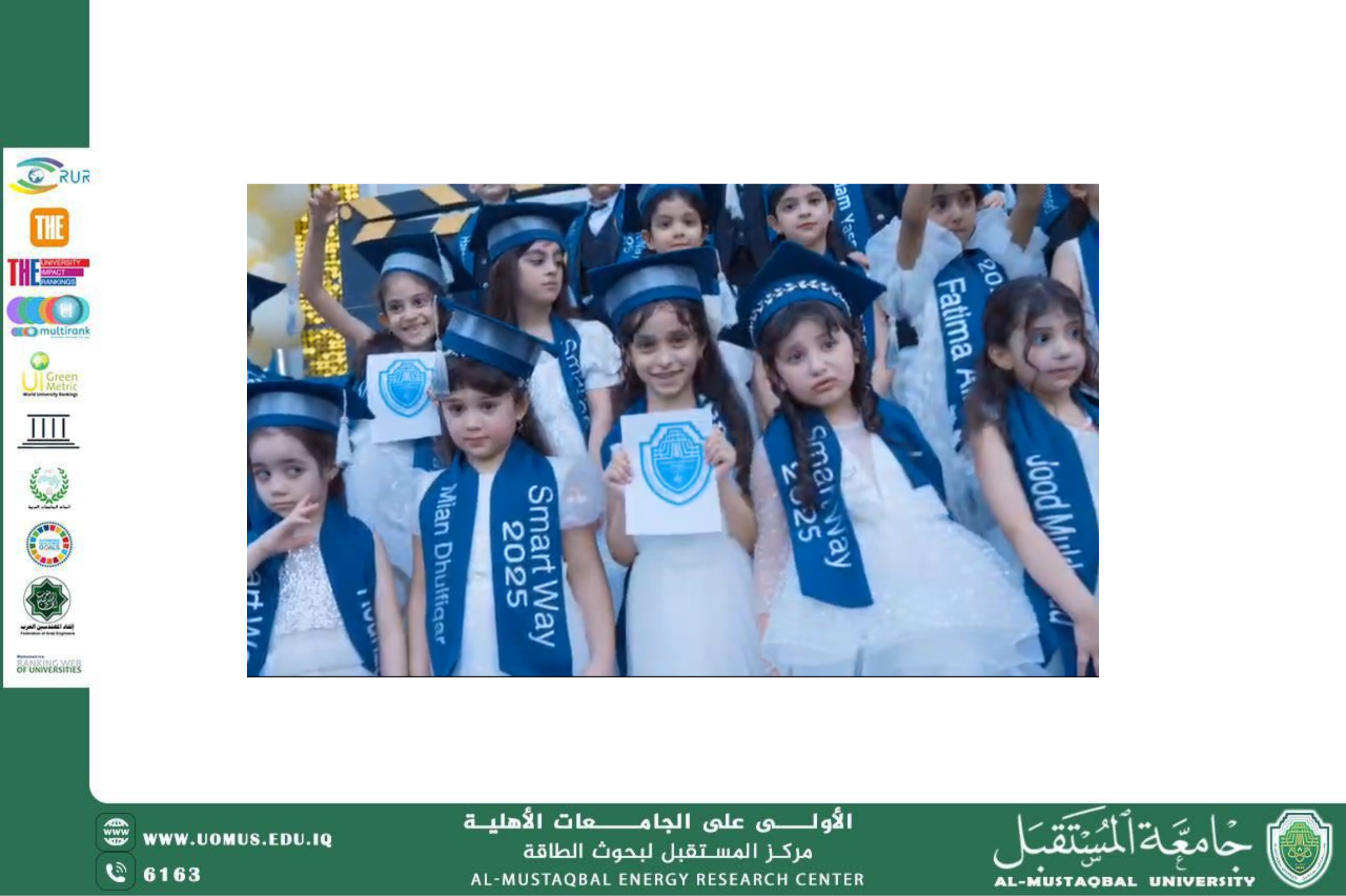 The Smart Way English Kindergarten hosted a joyful and knowledge-rich graduation ceremony for its students, marked by an engaging and interactive atmosphere. The event was distinguished by the valued participation of the Energy Research Center at Al-Mustaqbal University and the College of Engineering Technologies, whose contributions added depth and inspiration to the celebration. As part of the program, the students took part in a series of educational competitions and interactive quizzes designed in a fun and simplified manner. These activities introduced the children to the Sustainable Development Goals (SDGs) and the concept of renewable energy, including its various types and the positive impact it has on both the environment and society. To encourage a spirit of healthy competition, solar-powered lamps were distributed as special prizes to the students who answered questions correctly. These thoughtful gifts were generously provided by the Future Energy Sales Center, located on Street 40, as part of its ongoing commitment to community awareness and education. At the conclusion of the ceremony, the kindergarten administration expressed its deep appreciation and gratitude to the Energy Research Center and the College of Engineering Technologies for their valuable efforts and unique contributions, which enriched the event with both useful knowledge and entertaining activities. The administration further emphasized that such initiatives play a vital role in raising environmental and scientific awareness among students, while nurturing a culture of sustainability and responsibility that will positively influence their future education and lives.
