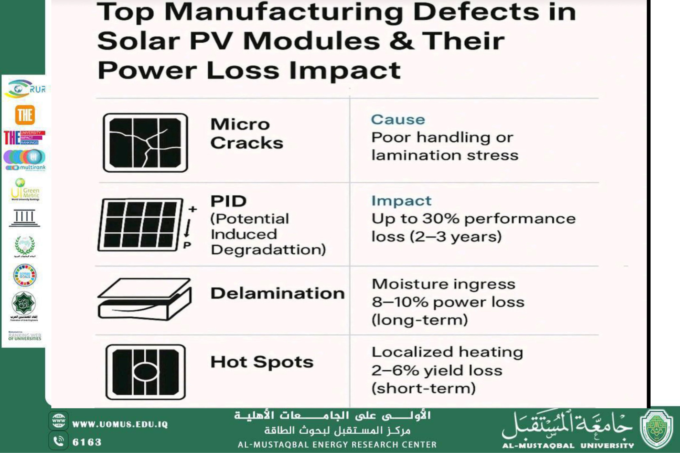 Solar energy is one of the most promising renewable resources for building a sustainable future. However, the performance and reliability of solar photovoltaic (PV) modules can be significantly affected by certain manufacturing defects or issues during handling and installation. Key defects and their impacts include: • Micro-cracks: Often caused by mishandling or lamination stress. • Potential Induced Degradation (PID): Can reduce performance by up to 30% within 2–3 years. • Delamination: Moisture ingress may cause 8–10% long-term power loss. • Hot Spots: Localized heating can lead to 2–6% short-term yield loss. • Snail Trails: May reduce long-term efficiency by up to 2%. • Bubbles and voids in EVA: Moisture penetration can lower efficiency by 5–7% over time. • Glass breakage/edge chipping: Immediate rejection or field failure. Energy experts stress that ensuring proper quality control during manufacturing, transport, and installation is crucial to maximize module reliability and long-term performance. Such measures are key to advancing high-quality solar technologies, achieving maximum renewable energy output, and accelerating the global shift toward clean energy solutions.
