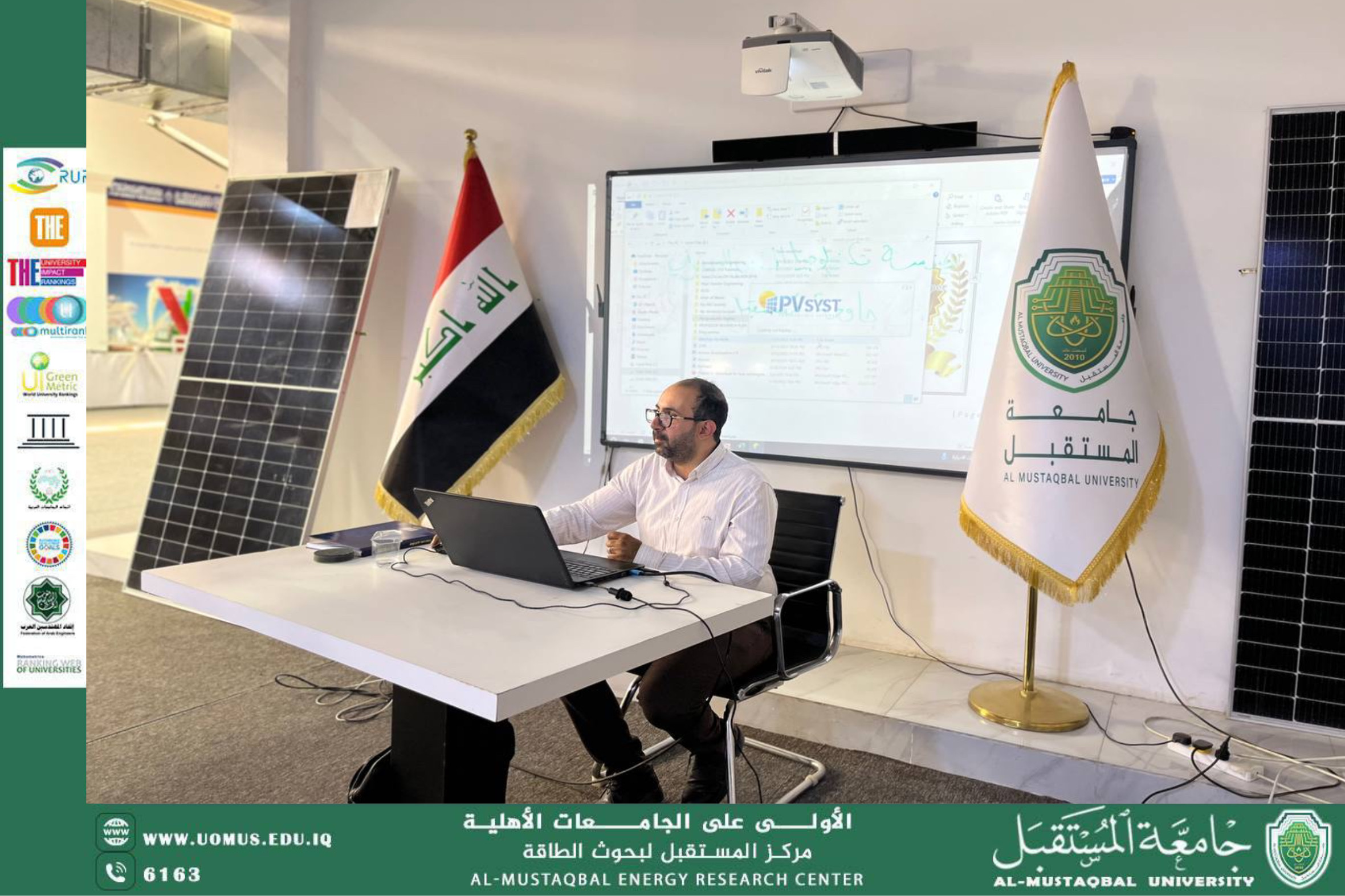 The Al-Mustaqbal Energy Research Center continues the activities of its “Solar Energy Hackathon” training program, launched as part of its initiatives to empower students and professionals in the field of renewable energy, with wide participation from engineering students and specialists. The session featured a comprehensive introduction to solar energy, covering fundamental concepts, its importance in the global transition to clean energy, and practical applications in electricity generation and carbon emission reduction. Dr. Ammar delivered a specialized lecture on PV Syst, one of the leading global software tools used for designing and evaluating photovoltaic systems. His detailed explanation included how to use the software to estimate power output, analyze performance, and conduct technical and economic feasibility studies for solar projects. The lecture also included interactive, hands-on training, enabling participants to practice directly with the software, thereby enhancing their skills in system design and real-world problem-solving within the solar energy sector. This training is part of the broader Solar Energy Hackathon competition, which combines specialized workshops and practical sessions, ultimately leading to the design of complete solar power projects to be evaluated by a panel of experts at the final stage. The center’s administration emphasized that the goal of the program is to equip a new generation of professionals with innovative, sustainable energy solutions, while bridging theoretical knowledge with practical applications to support national and global sustainable development goals.